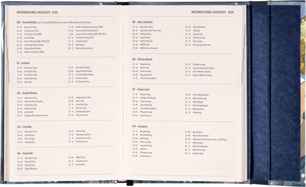 Týždenný diár v anglickom jazyku s medzinárodnými sviatkami a praktickým magnetickým uzatváraním je ideálnou voľbou pre tých, ktorí chcú mať svoje plány prehľadne pod kontrolou. Ponúka horizontálne rozloženie vo verzii týždeň na dvoch stranách s priestorom na poznámky. Súčasťou sú praktické mesačné prehľady, ideálne na plánovanie dovoleniek či prázdnin.