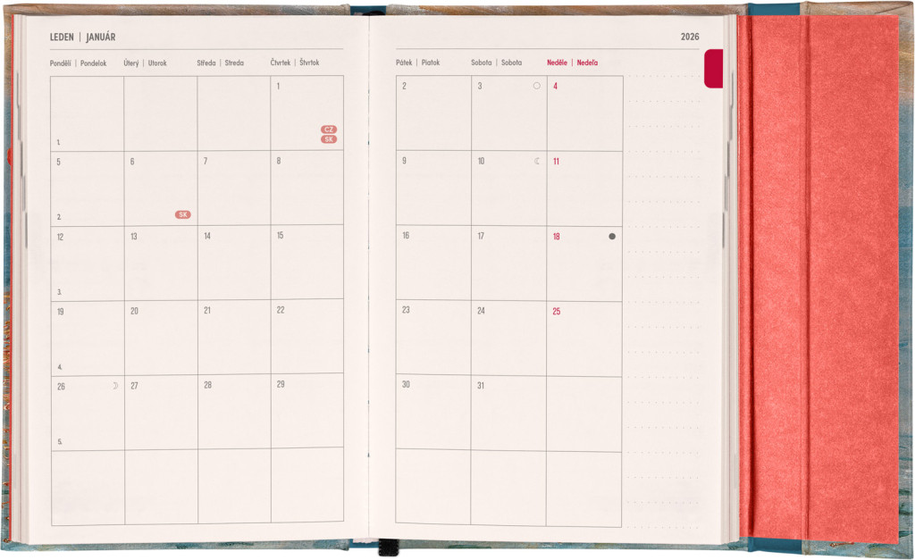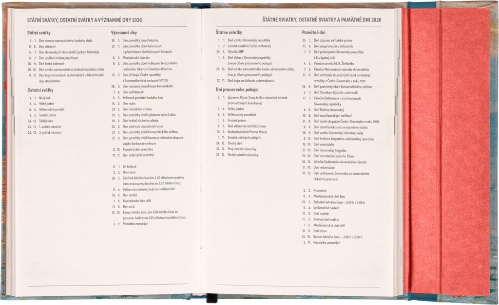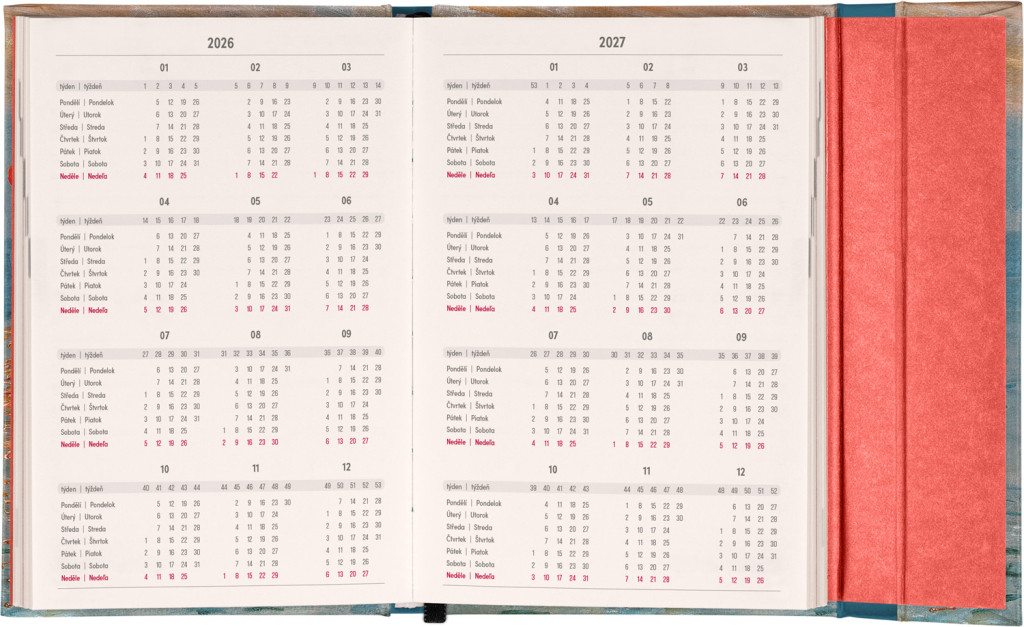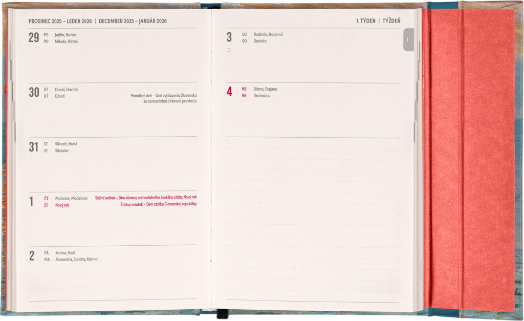 Týždenný diár s praktickým magnetickým uzatváraním je ideálnou voľbou pre tých, ktorí chcú mať svoje plány prehľadne pod kontrolou. Horizontálne rozloženie s českým a slovenským kalendáriom vo verzii týždeň na dvoch stranách s priestorom pre poznámky.Súčasťou sú praktické mesačné prehľady, ideálne na plánovanie dovoleniek či prázdnin a taktiež zoznam českých a slovenských sviatkov a menín.