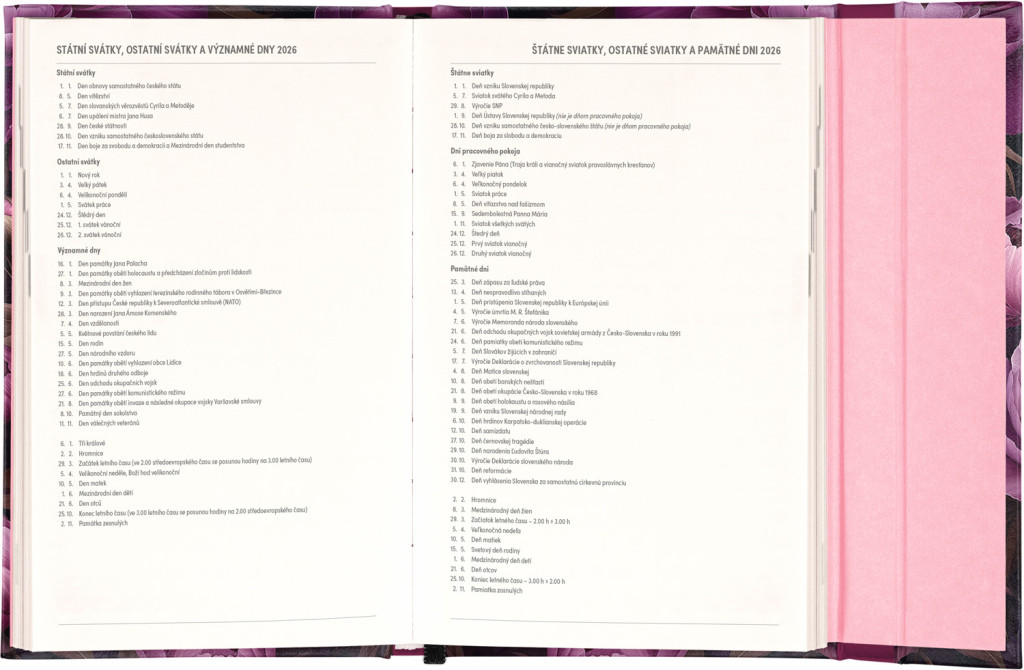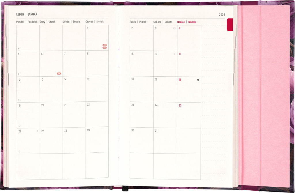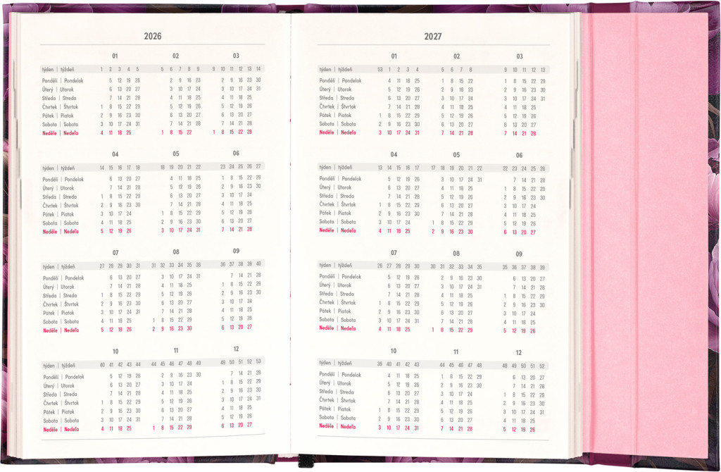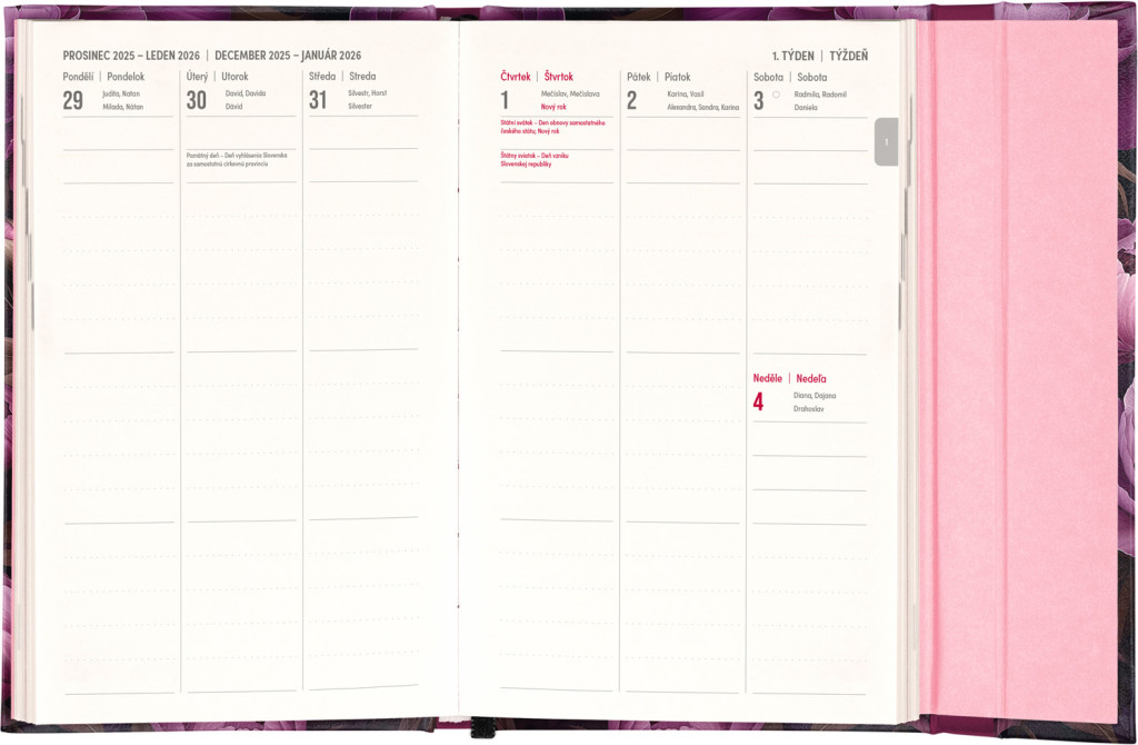 Týždenný diár s praktickým magnetickým uzatváraním je ideálnou voľbou pre tých, ktorí chcú mať svoje plány prehľadne pod kontrolou. Ponúka stĺpcové rozvrhnutie jednotlivých týždňov s dostatkom priestoru na každodenné poznámky. Súčasťou sú praktické mesačné prehľady, ideálne na plánovanie dovoleniek či prázdnin, a tiež zoznam českých a slovenských sviatkov a menín.