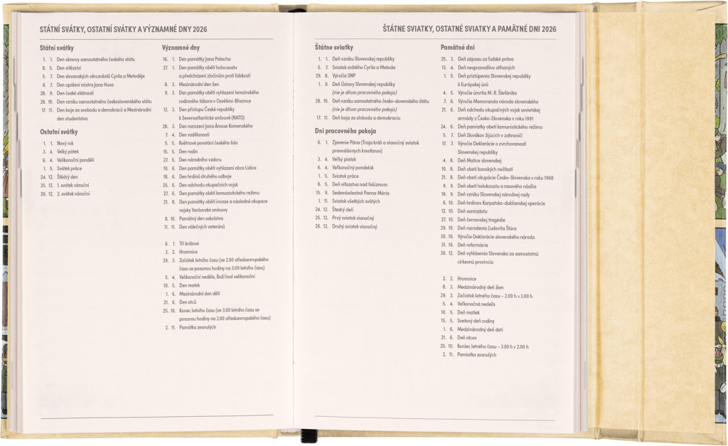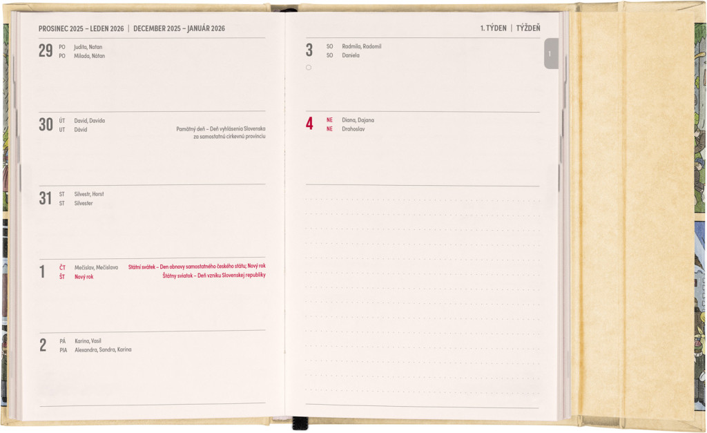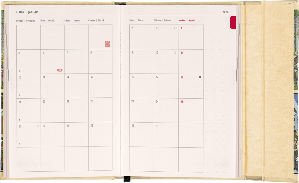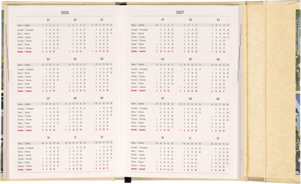 Týždenný diár s praktickým magnetickým uzatváraním je ideálnou voľbou pre tých, ktorí chcú mať svoje plány prehľadne pod kontrolou. Horizontálne rozloženie s českým a slovenským kalendáriom vo verzii týždeň na dvoch stranách s priestorom pre poznámky. Súčasťou sú praktické mesačné prehľady, ideálne na plánovanie dovoleniek či prázdnin a taktiež zoznam českých a slovenských sviatkov a menín.