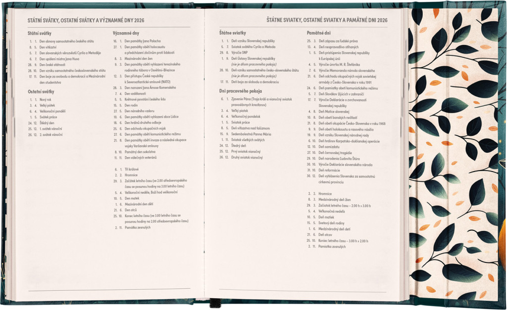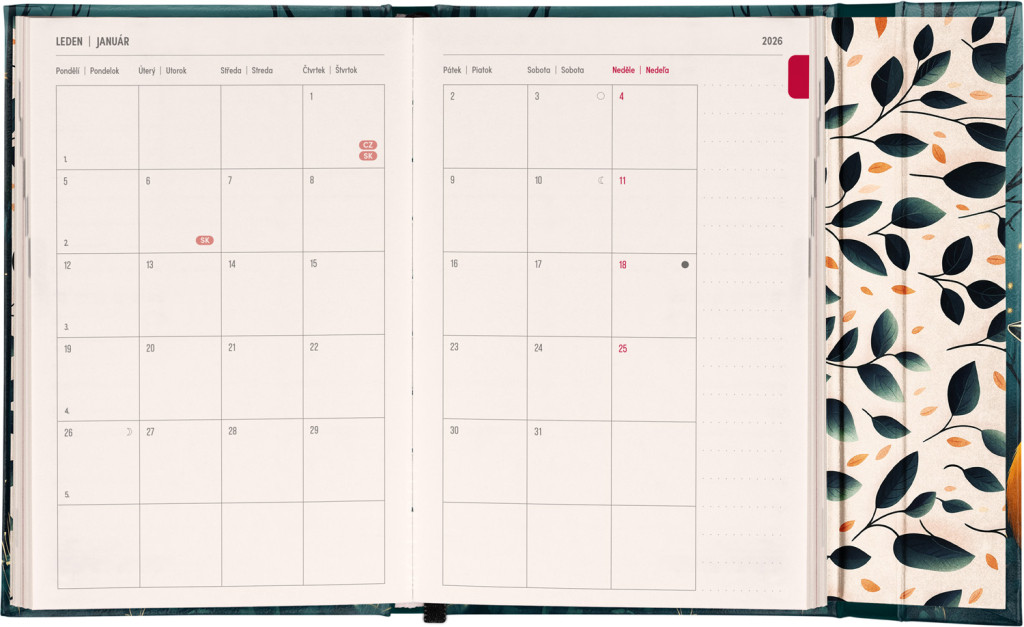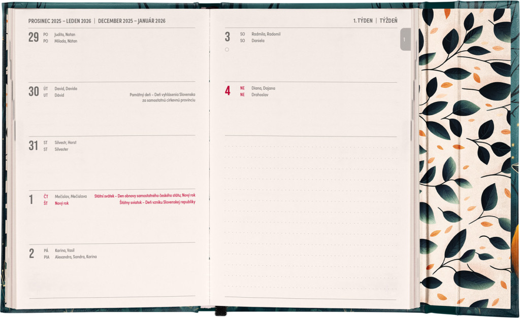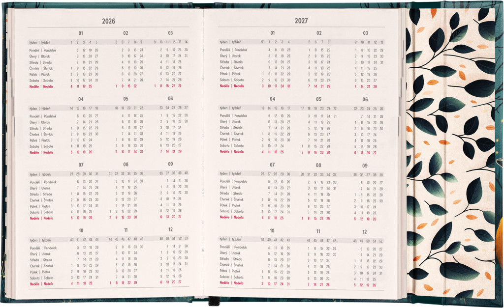 Týždenný diár s praktickým magnetickým uzatváraním je ideálnou voľbou pre tých, ktorí chcú mať svoje plány prehľadne pod kontrolou. Horizontálne rozloženie s českým a slovenským kalendáriom vo verzii týždeň na dvoch stranách s priestorom pre poznámky.Súčasťou sú praktické mesačné prehľady, ideálne na plánovanie dovoleniek či prázdnin a taktiež zoznam českých a slovenských sviatkov a menín.