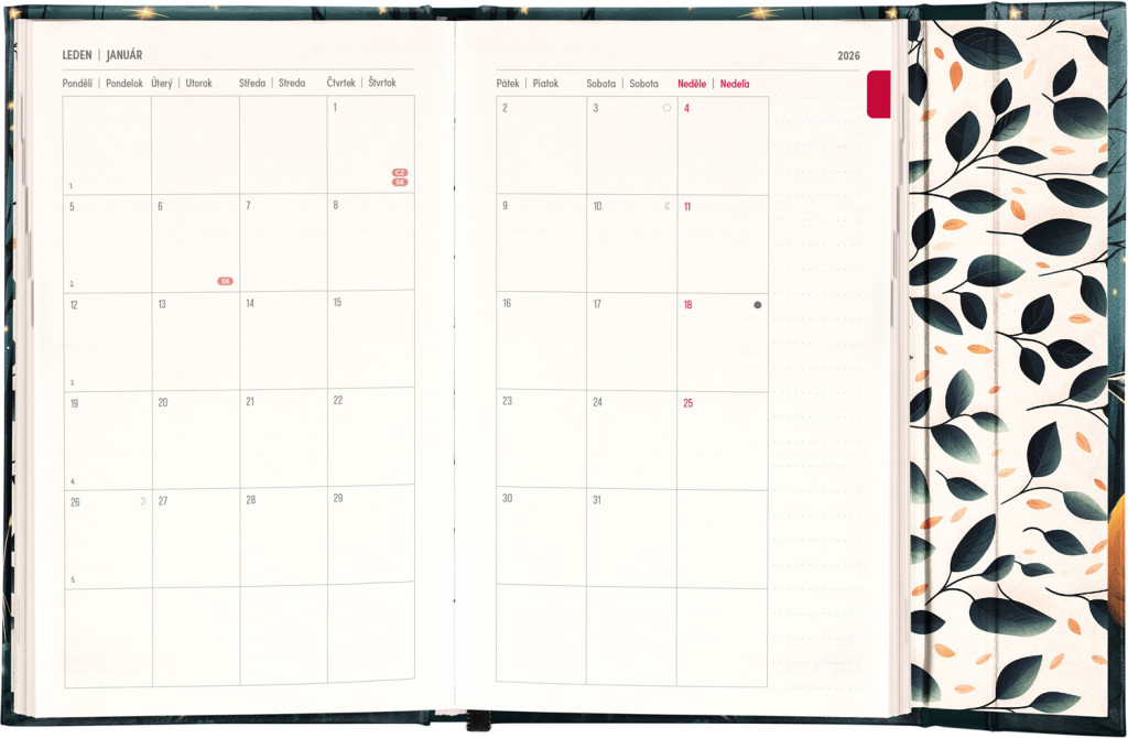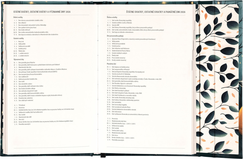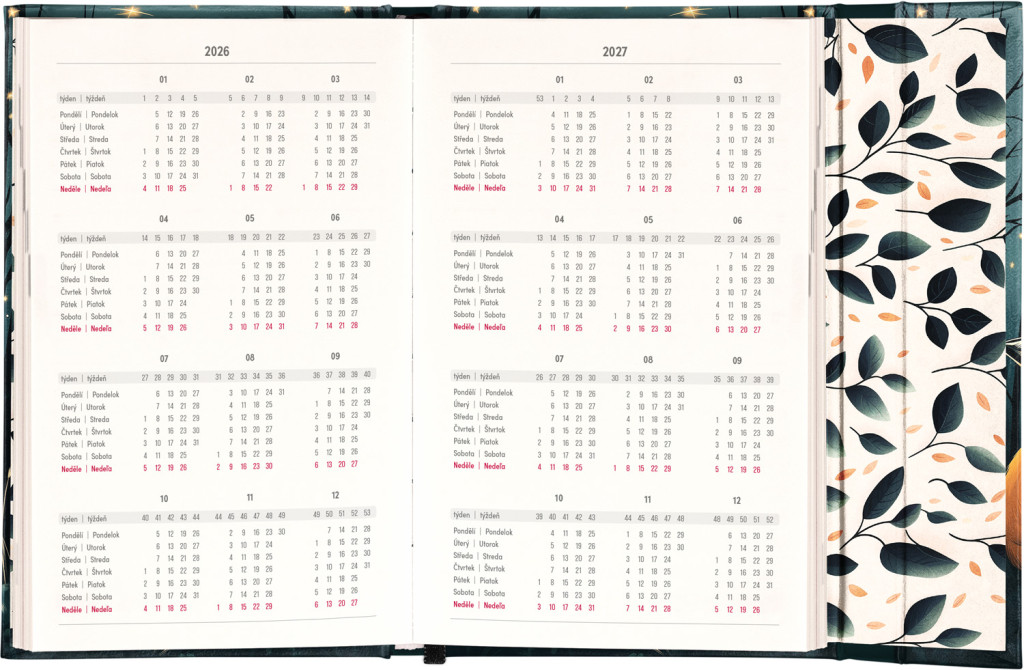 Týždenný diár s praktickým magnetickým uzatváraním je ideálnou voľbou pre tých, ktorí chcú mať svoje plány prehľadne pod kontrolou. Ponúka stĺpcové rozvrhnutie jednotlivých týždňov s dostatkom priestoru na každodenné poznámky. Súčasťou sú praktické mesačné prehľady, ideálne na plánovanie dovoleniek či prázdnin, a tiež zoznam českých a slovenských sviatkov a menín.