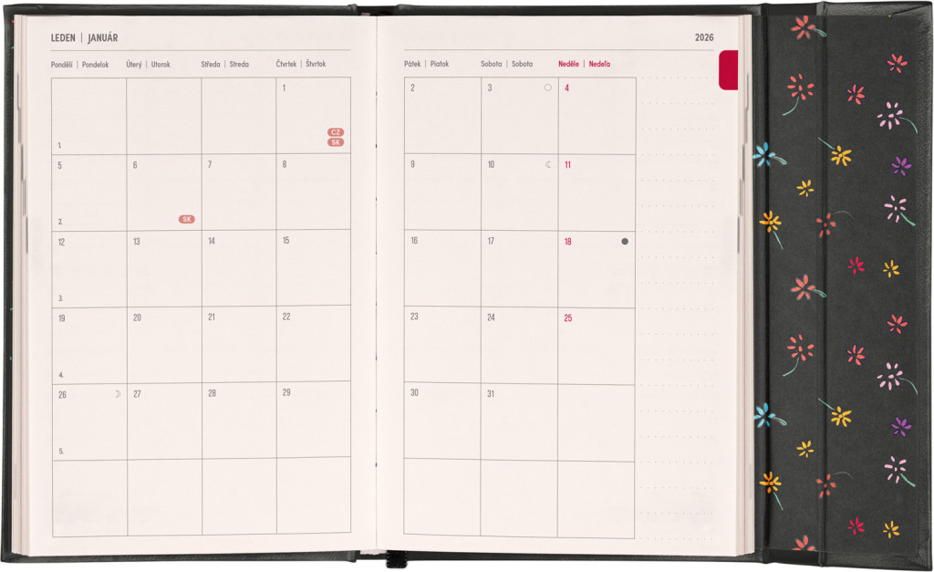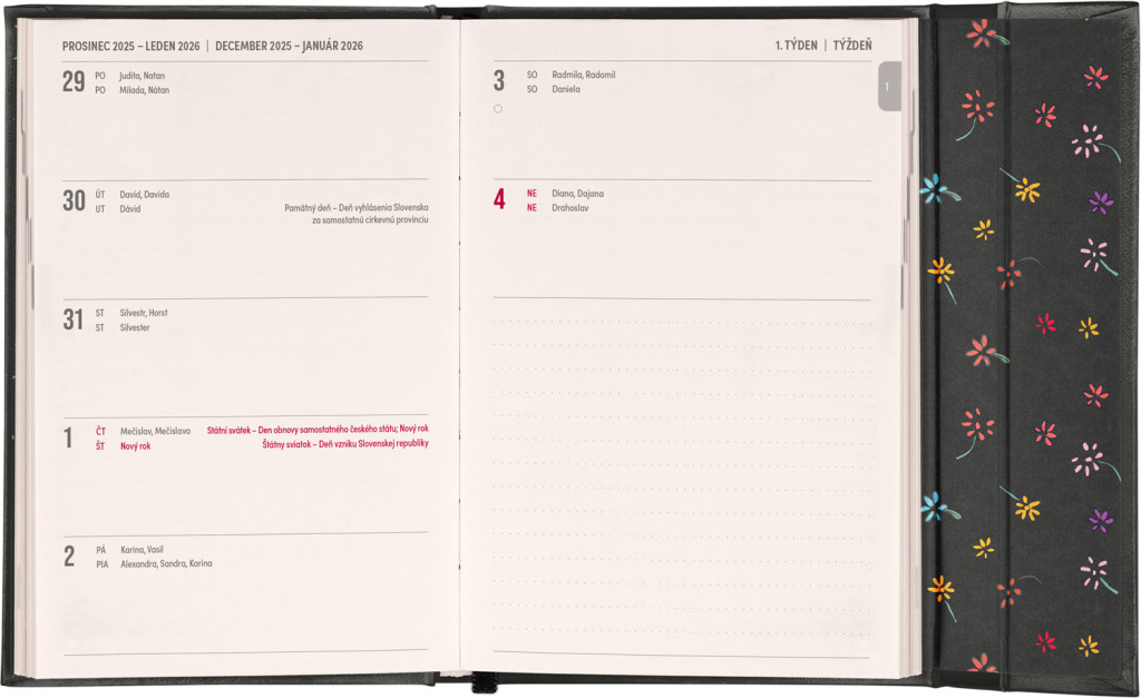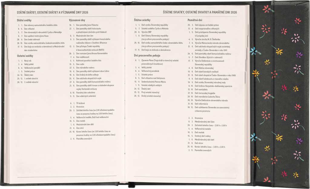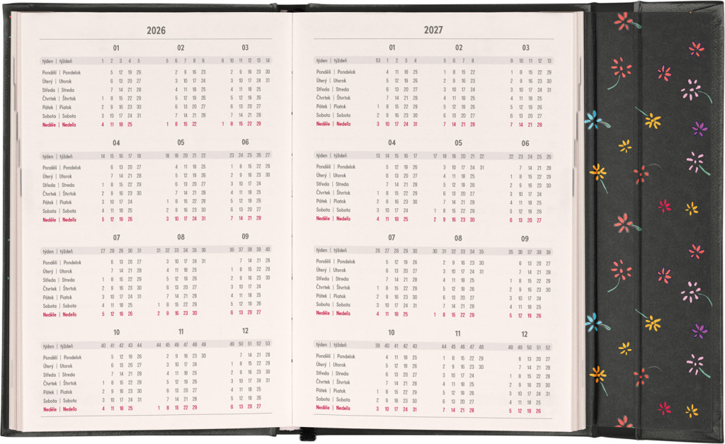Týždenný diár s praktickým magnetickým uzatváraním je ideálnou voľbou pre tých, ktorí chcú mať svoje plány prehľadne pod kontrolou. Horizontálne rozloženie s českým a slovenským kalendáriom vo verzii týždeň na dvoch stranách s priestorom pre poznámky.Súčasťou sú praktické mesačné prehľady, ideálne na plánovanie dovoleniek či prázdnin a taktiež zoznam českých a slovenských sviatkov a menín.