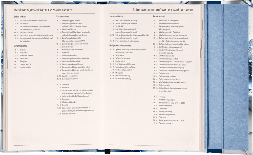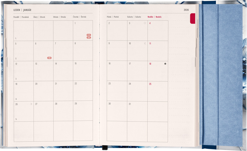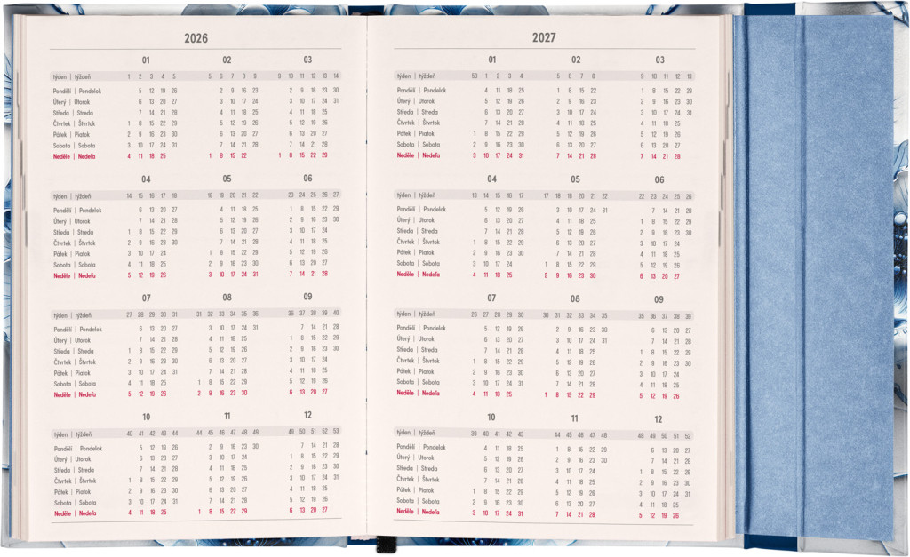 Týždenný diár s praktickým magnetickým uzatváraním je ideálnou voľbou pre tých, ktorí chcú mať svoje plány prehľadne pod kontrolou. Horizontálne rozloženie s českým a slovenským kalendáriom vo verzii týždeň na dvoch stranách s priestorom pre poznámky.Súčasťou sú praktické mesačné prehľady, ideálne na plánovanie dovoleniek či prázdnin a taktiež zoznam českých a slovenských sviatkov a menín.