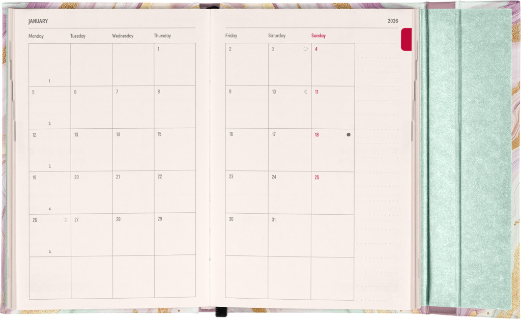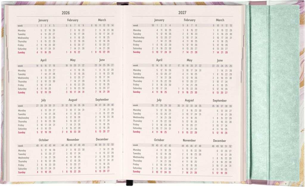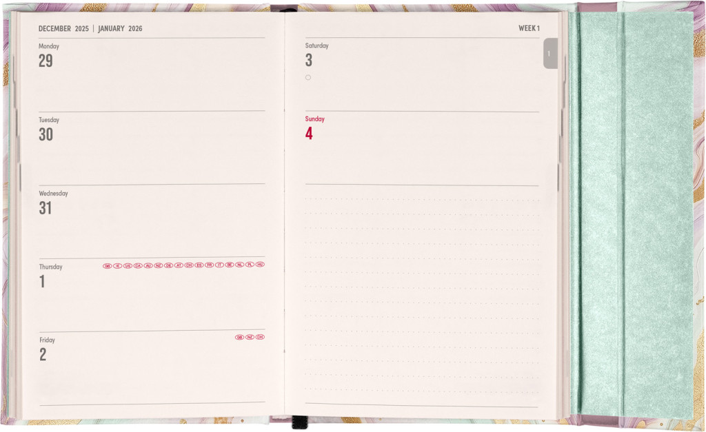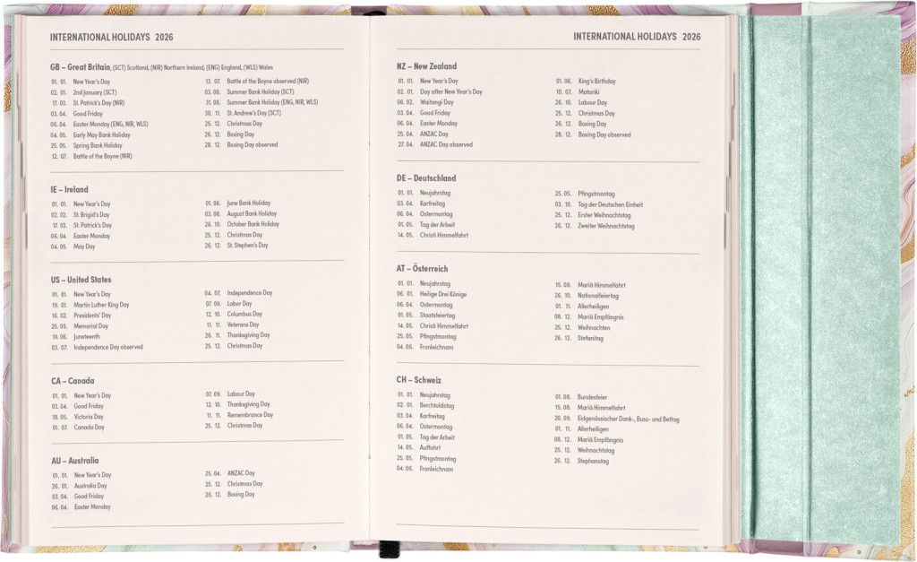 Týždenný diár v anglickom jazyku s medzinárodnými sviatkami a praktickým magnetickým uzatváraním je ideálnou voľbou pre tých, ktorí chcú mať svoje plány prehľadne pod kontrolou. Ponúka horizontálne rozloženie vo verzii týždeň na dvoch stranách s priestorom na poznámky. Súčasťou sú praktické mesačné prehľady, ideálne na plánovanie dovoleniek či prázdnin.