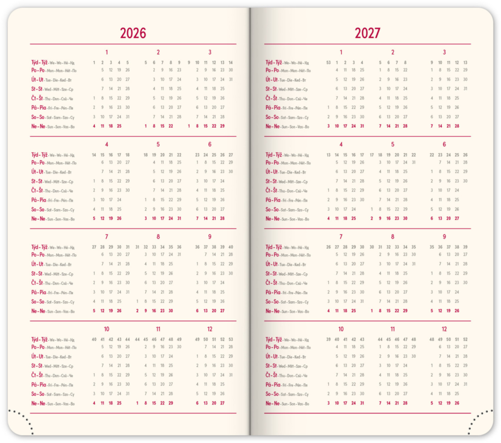 Nový rad diárov s výrazným letopočtom. Povrch má jemnú štruktúru a je vhodný pre všetky typy razieb. Týždenné rozloženie s česko-slovenským kalendáriom a doplnkovou angličtinou, nemčinou, maďarčinou a ruštinou.