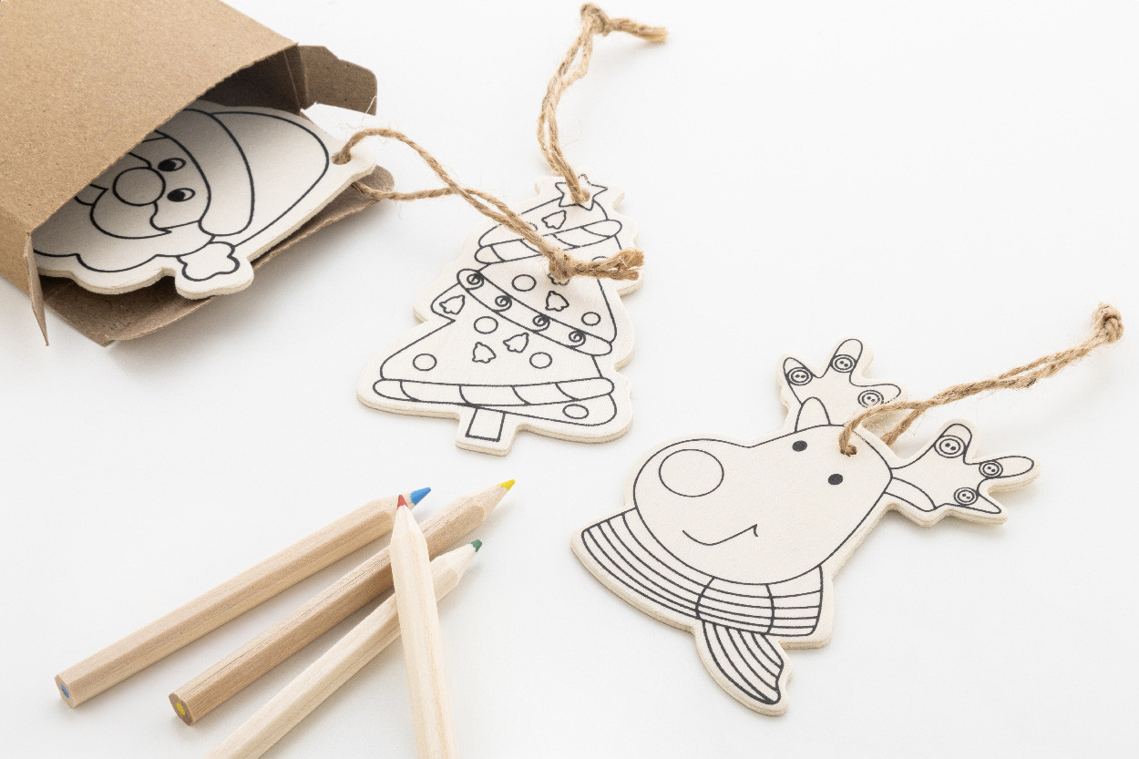 Sada vianočných ozdôb na vyfarbenie v krabičke z kraftového papiera s vyrezávaným vianočným stromčekom. Vrátane 3 drevených ozdôb s konopnou šnúrou a 4 farebných ceruziek.