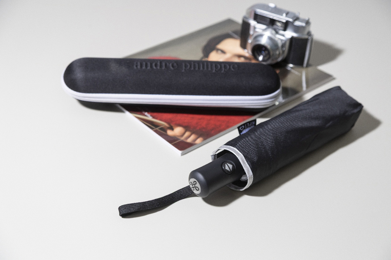 Plne automatický (otváranie/zatváranie), vetru odolný skladací dáždnik s 8 panelmi, strieborné lemovanie. S kovovým rámom, rebrami zo sklených vlákien, pogumovanou rukoväťou s popruhom na ruku a puzdrom na prenášanie. Ponge 190T RPET. S výrazným štítkom RPET. V značkovom pevnom puzdre na zips. Výrobok André Philippe.