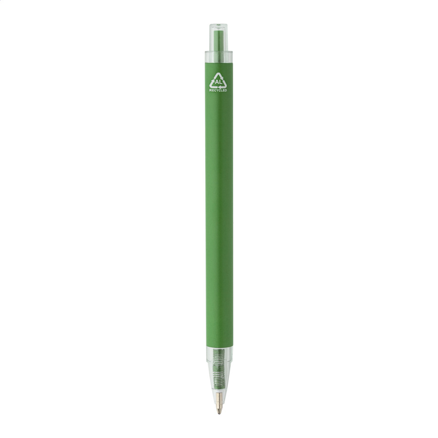 Guľôčkové pero z recyklovaného hliníka s matným telom a priehľadnými RPET časťami. S modrou náplňou.