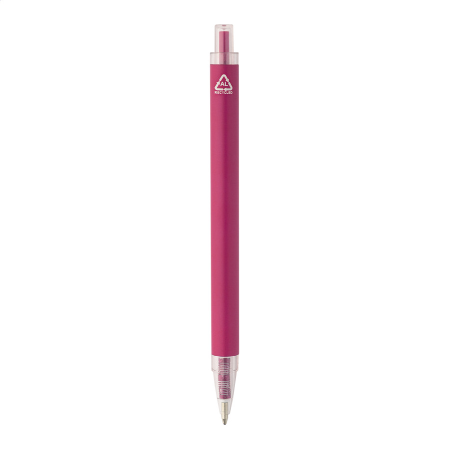 Guľôčkové pero z recyklovaného hliníka s matným telom a priehľadnými RPET časťami. S modrou náplňou.