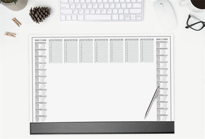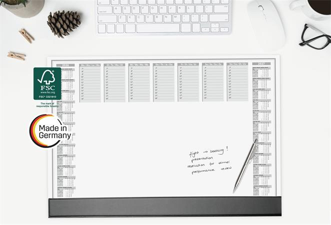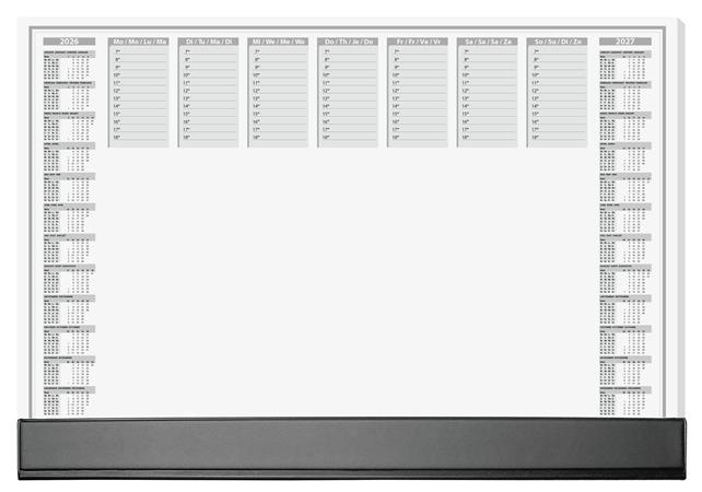 -s dvojročným kalendárom (2026/2027) -s týždenným plánovačom -štvorjazyčný: angličtina, nemčina, francúzština a holandčina -veľkosť: približne A2 -plastový pásik na spodnom okraji pre dodatočnú ochranu, na ktorom možno uchovať aj kúsky papiera -odolný, protišmykový a vďaka masívnej kartónovej zadnej doske úplne rovno leží -použiteľný aj ako podložka pod myš -40 listov -farba: sivá -s certifikátom FSC