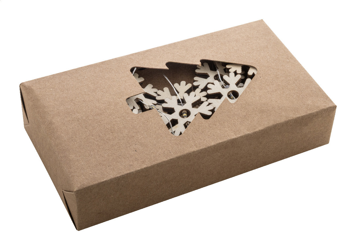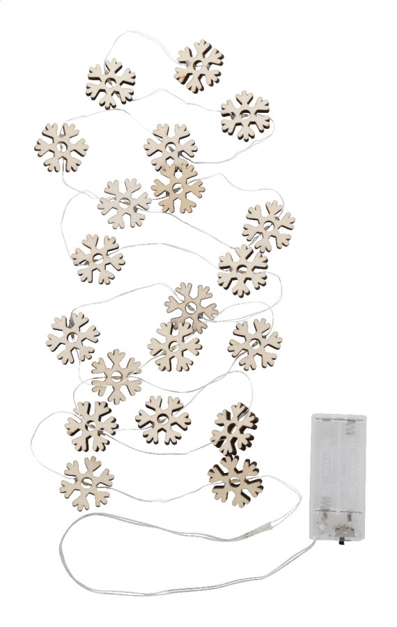 Vianočná svetelná dekorácia s 20 LED svetlami v tvare drevenej snehovej vločky. Funguje na 2 AA batérie, bez batérií. S tlačidlom ZAP/VYP na puzdre na batérie. V krabičke z kraftového papiera.