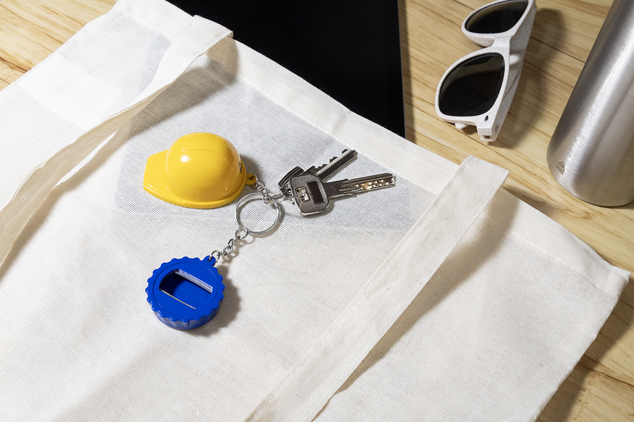 Prívesok na kľúče v tvare viečka z recyklovaného ABS plastu s otváračom.