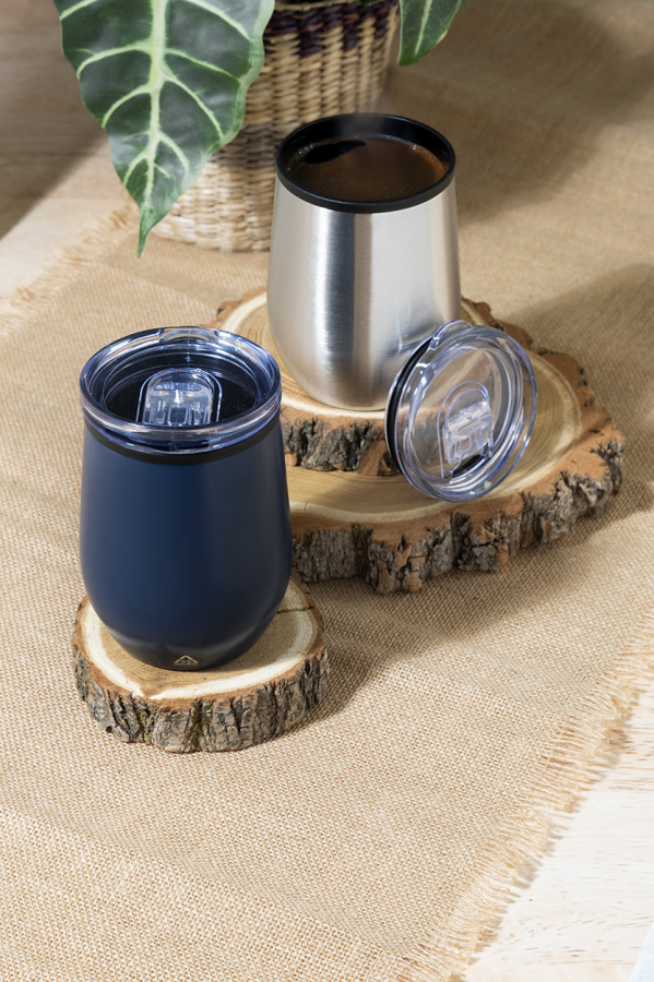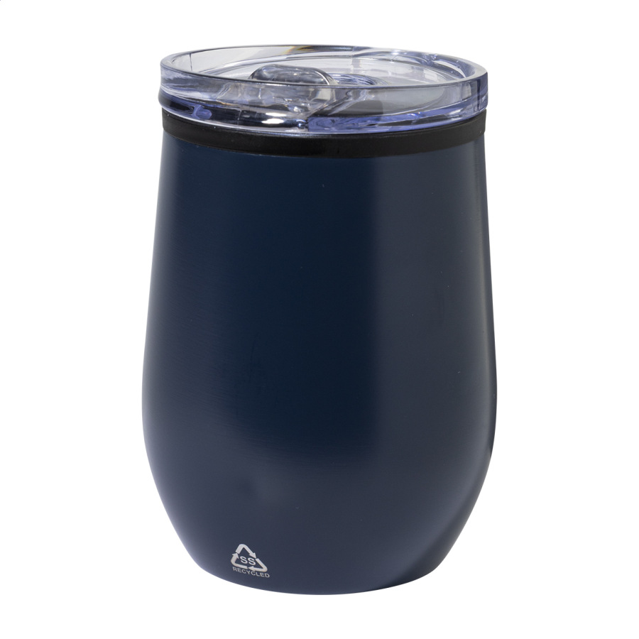 Dvojstenný termo hrnček z recyklovanej nerezovej ocele s vnútornou stranou z PP a viečkom z PS. 350 ml.