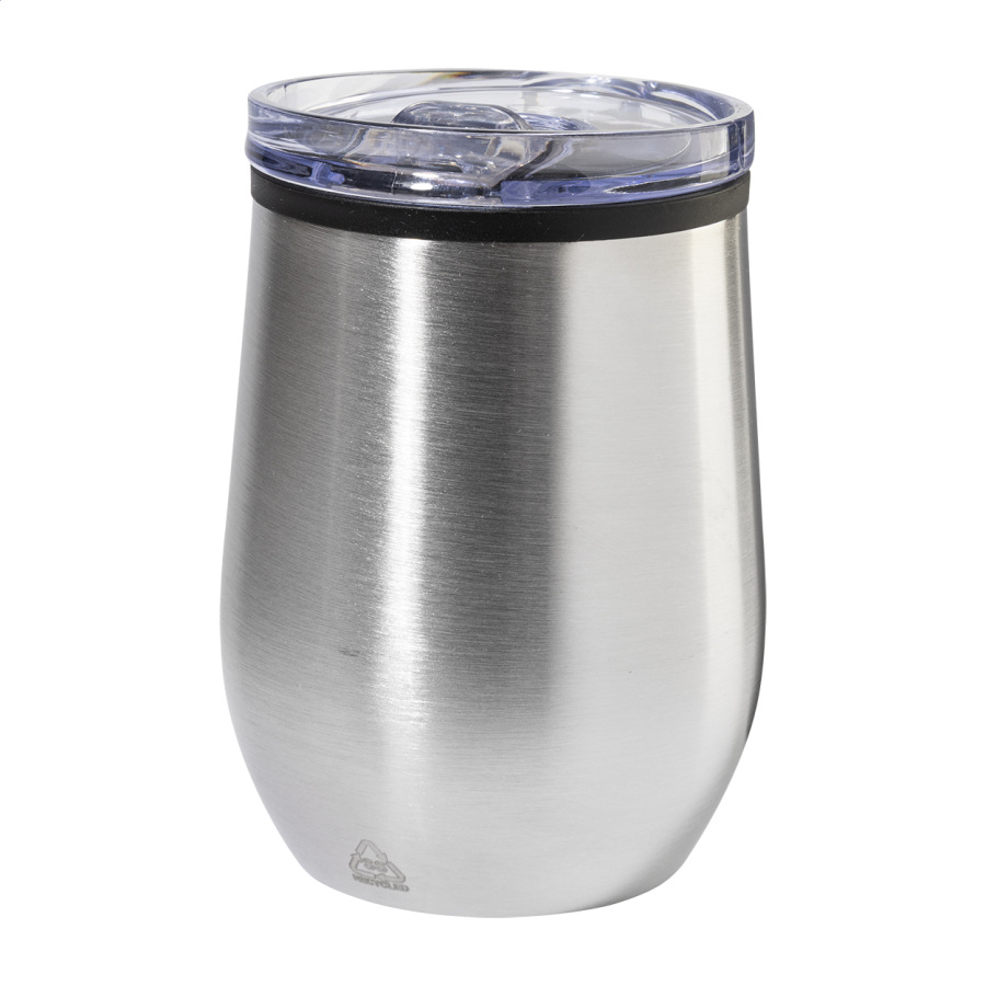 Dvojstenný termo hrnček z recyklovanej nerezovej ocele s vnútornou stranou z PP a viečkom z PS. 350 ml.