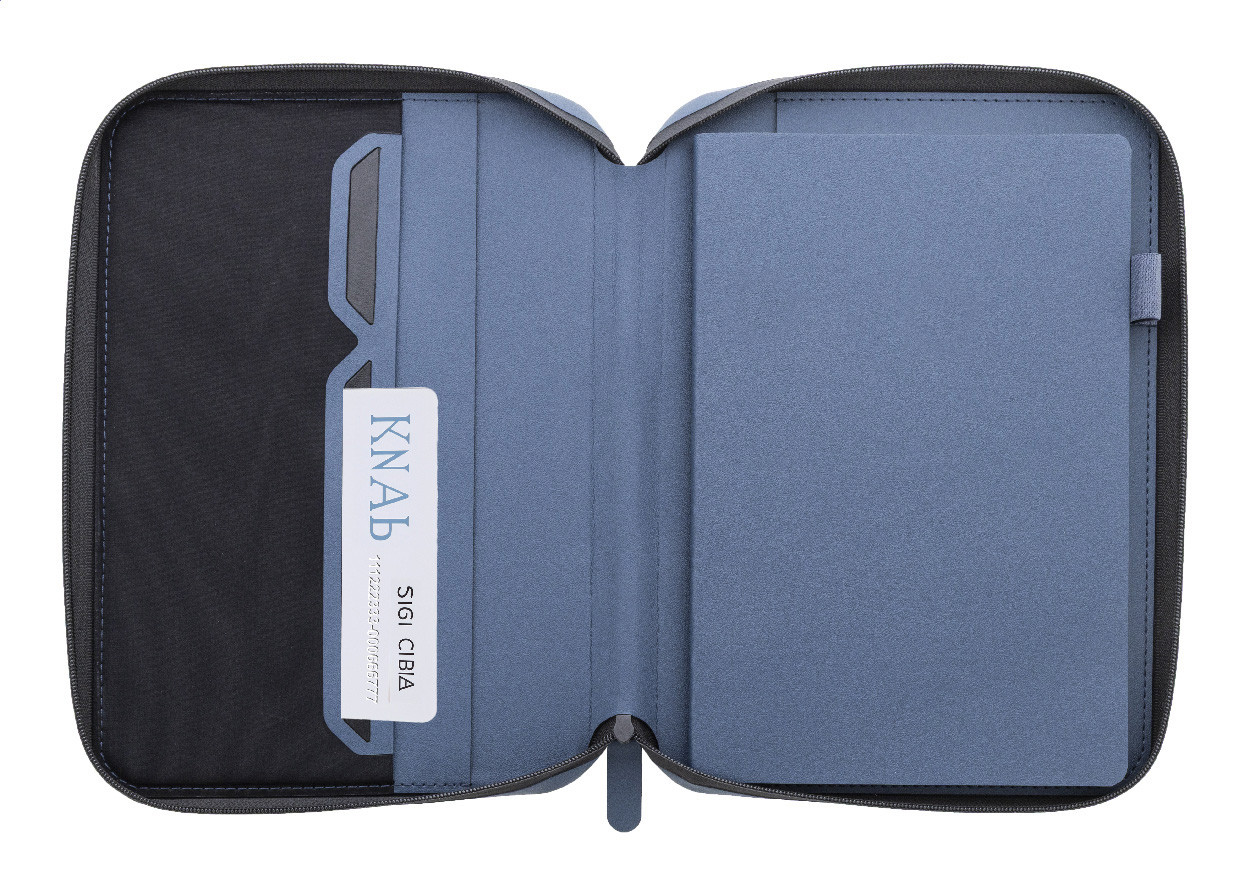 Luxusná zložka na dokumenty A5 na zips z recyklovanej umelej kože s 64 linajkovými listami a blokom z recyklovaného papiera. S niekoľkými vnútornými vreckami na karty a dokumenty.