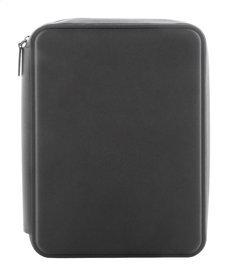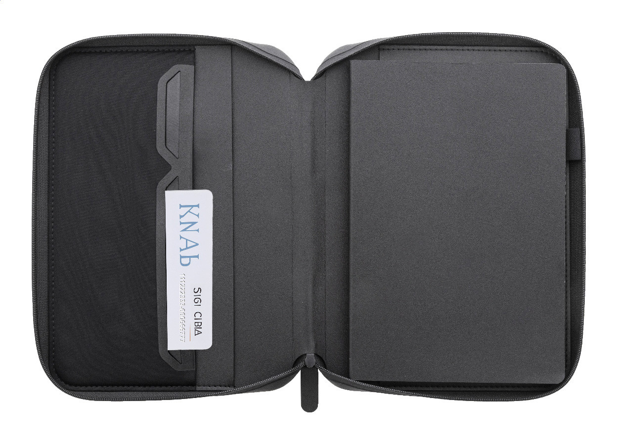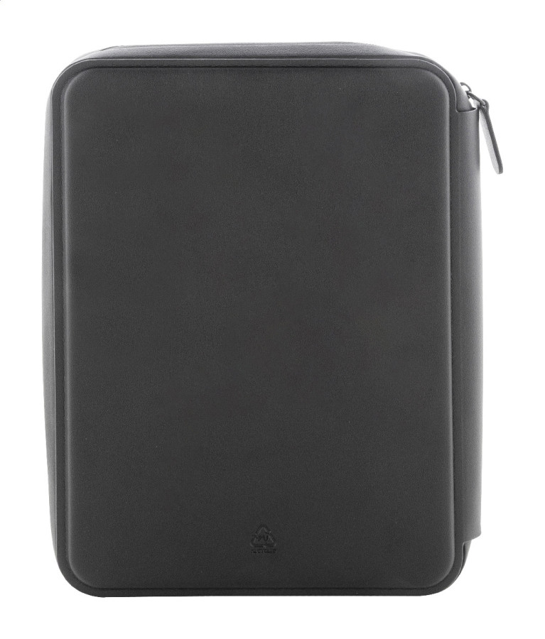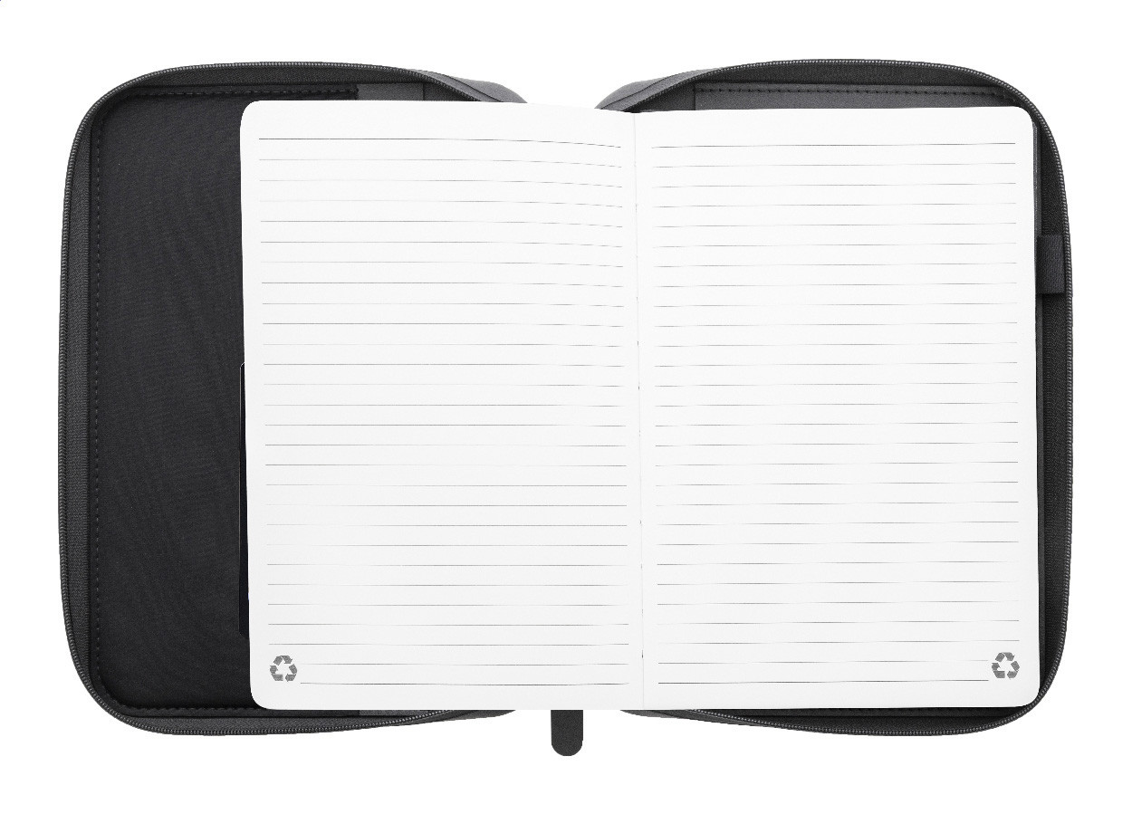Luxusná zložka na dokumenty A5 na zips z recyklovanej umelej kože s 64 linajkovými listami a blokom z recyklovaného papiera. S niekoľkými vnútornými vreckami na karty a dokumenty.