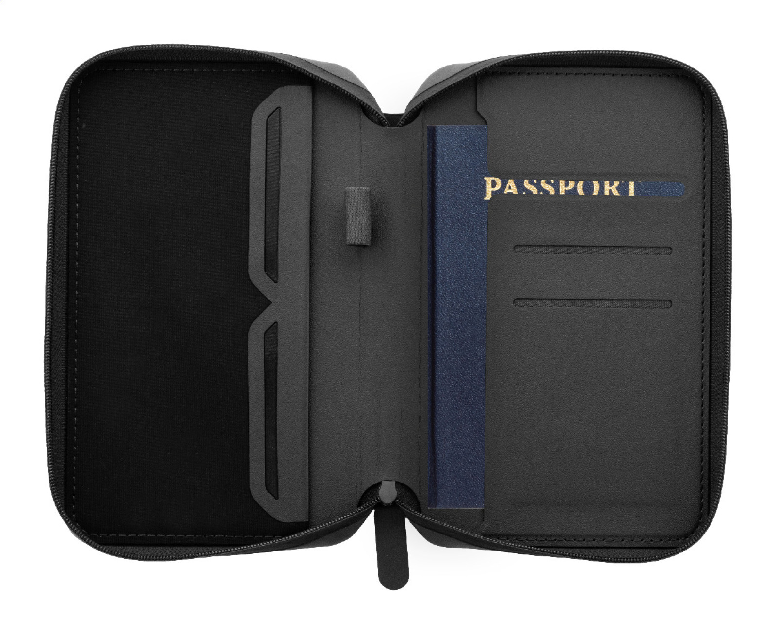 Luxusný cestovný organizér a puzdro na pás na zips z recyklovanej umelej kože. S niekoľkými vnútornými vreckami na dokumenty, karty a cestovné nevyhnutnosti.