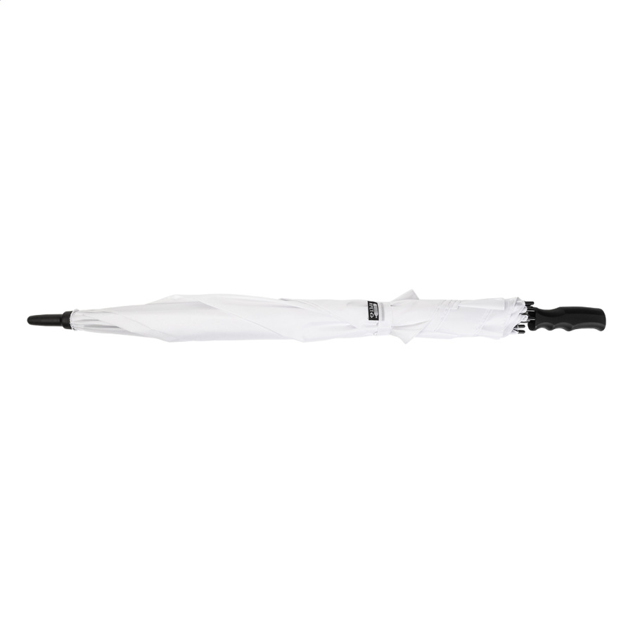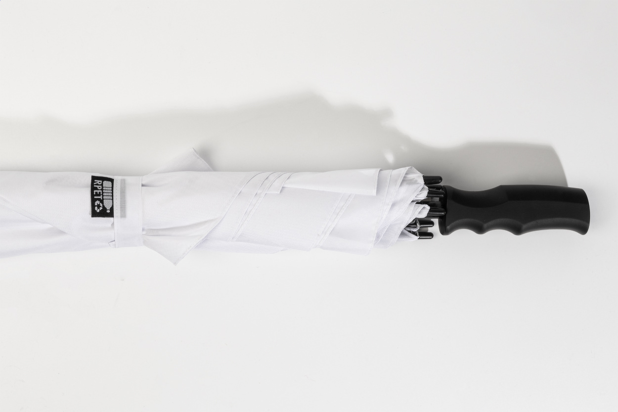 Veľký automatický vetruodolný štvorcový dáždnik s celolaminátovou tyčou a rámom, pogumovanou ABS rukoväťou. 190T RPET pongee. S charakteristickým RPET štítkom.