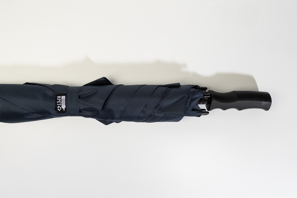 Veľký automatický vetruodolný štvorcový dáždnik s celolaminátovou tyčou a rámom, pogumovanou ABS rukoväťou. 190T RPET pongee. S charakteristickým RPET štítkom.