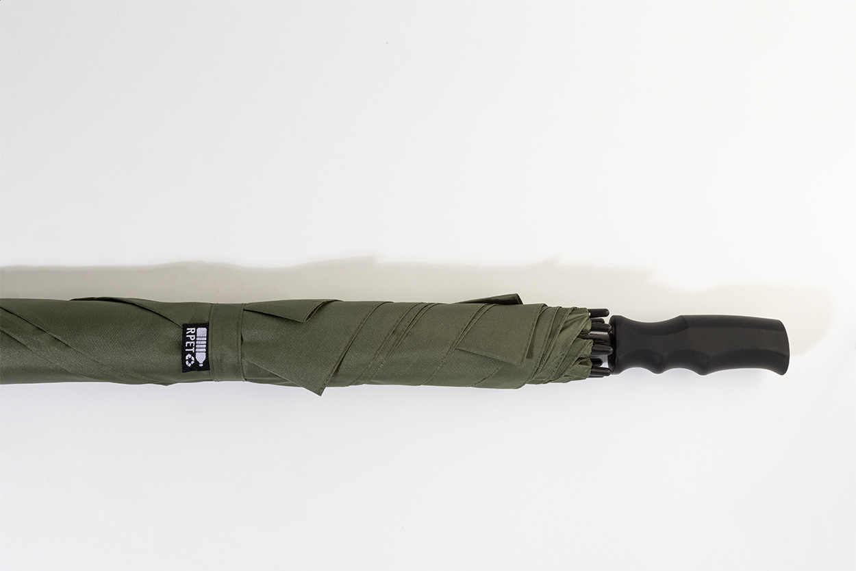 Veľký automatický vetruodolný štvorcový dáždnik s celolaminátovou tyčou a rámom, pogumovanou ABS rukoväťou. 190T RPET pongee. S charakteristickým RPET štítkom.