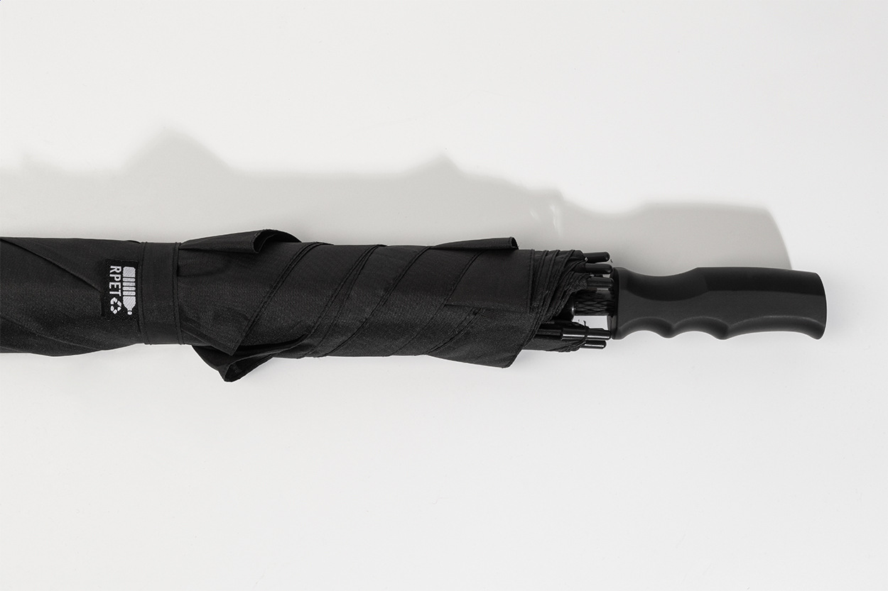 Veľký automatický vetruodolný štvorcový dáždnik s celolaminátovou tyčou a rámom, pogumovanou ABS rukoväťou. 190T RPET pongee. S charakteristickým RPET štítkom.