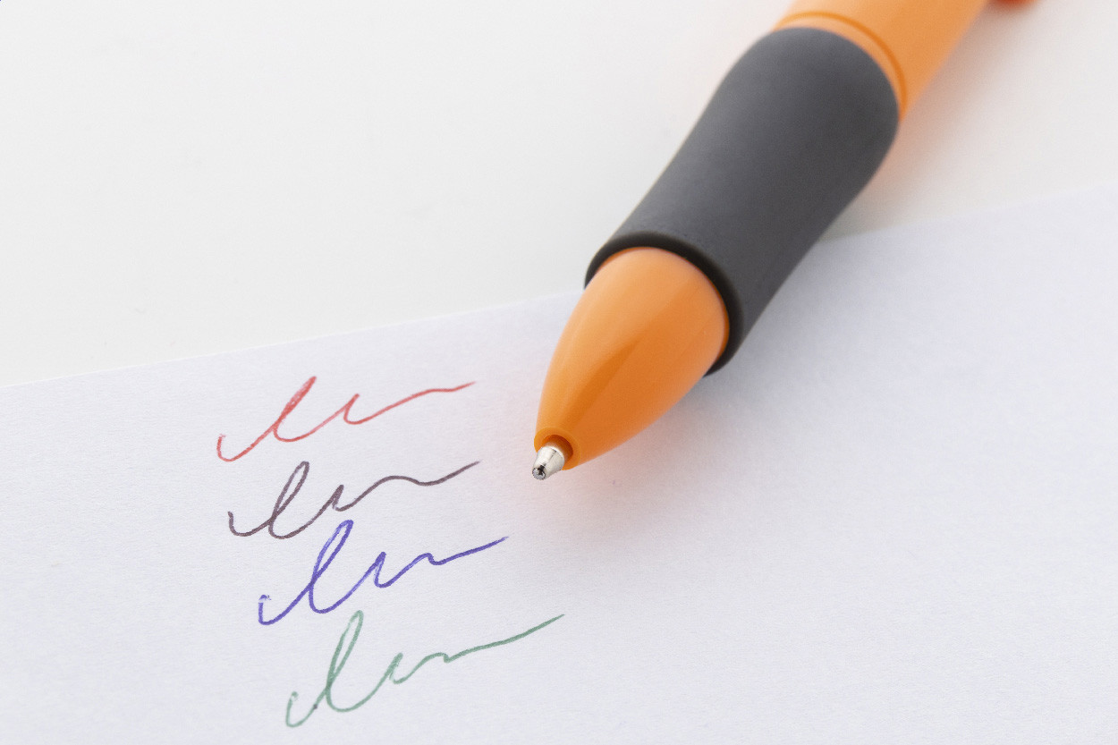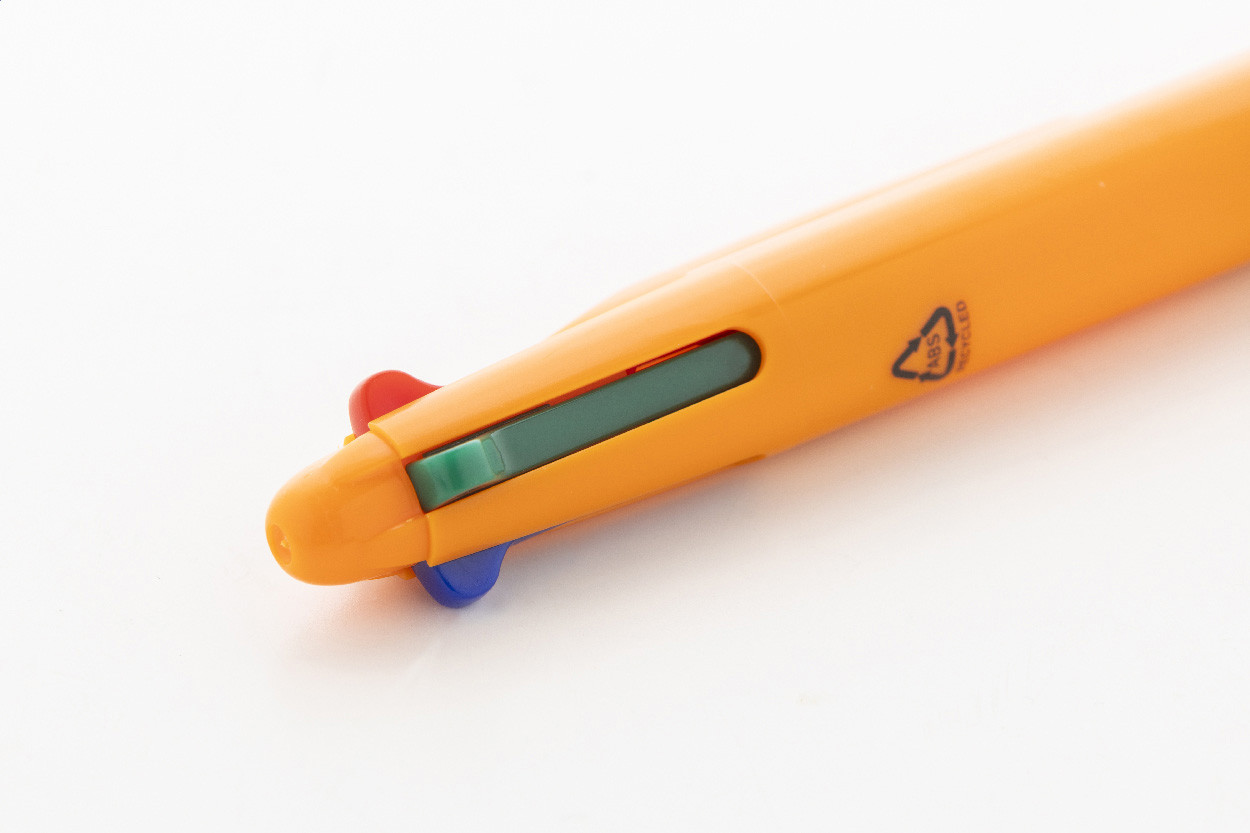 Viacfarebné guľôčkové pero z recyklovaného ABS materiálu s gumovým úchopom. S čiernou, modrou, červenou a zelenou náplňou.