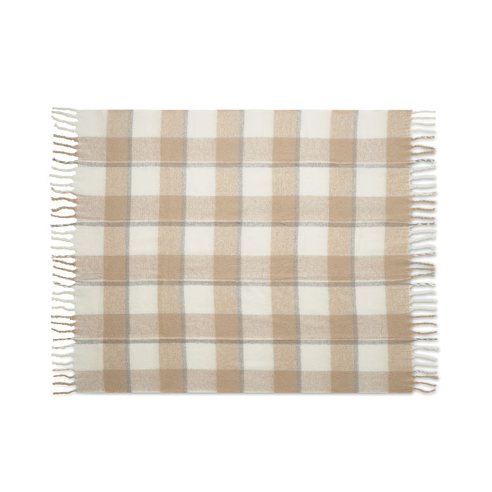 Kostkovaná RPET polyesterová deka z mohéru s ručně rolovanými třásněmi. Zabalená do stuhy s kartičkou pro potisk.