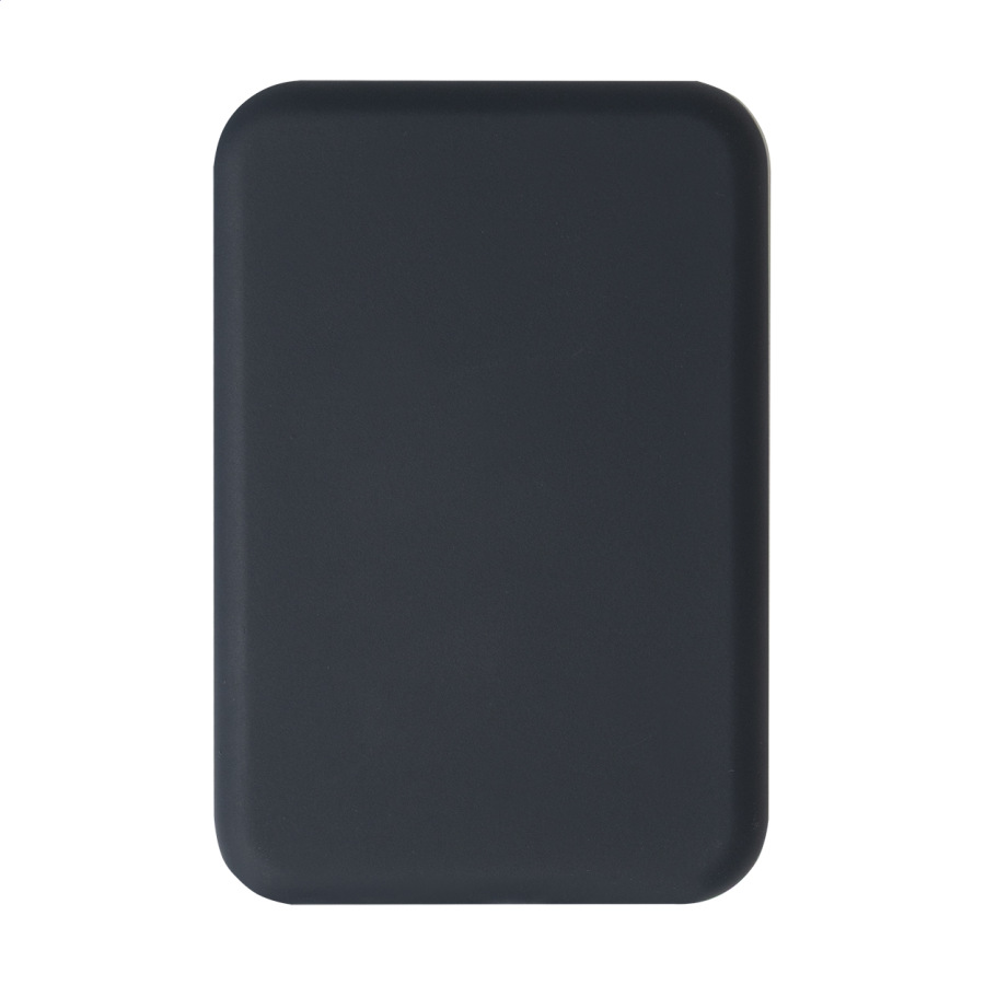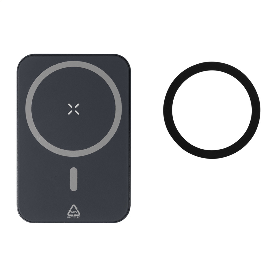 Power banka z recyklovaného ABS s 5000 mAh batériou a vstavanou magnetickou bezdrôtovou nabíjačkou (5W). So vstupom USB-C a portom pre nabíjačku. Vrátane USB nabíjacieho kábla.