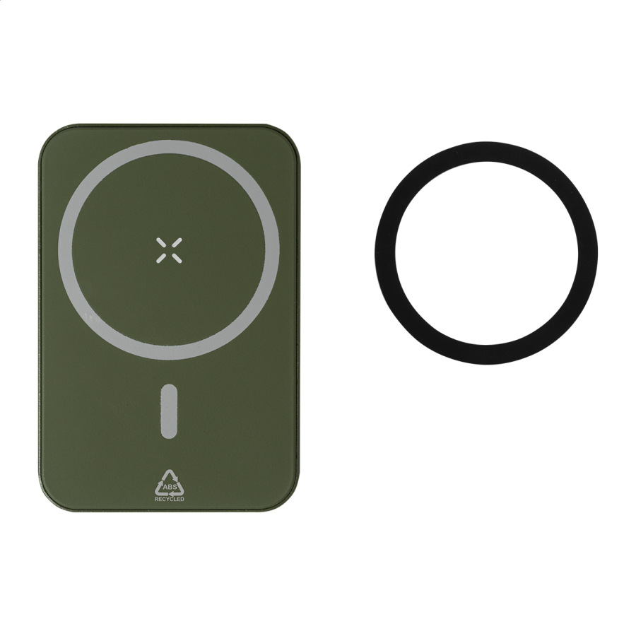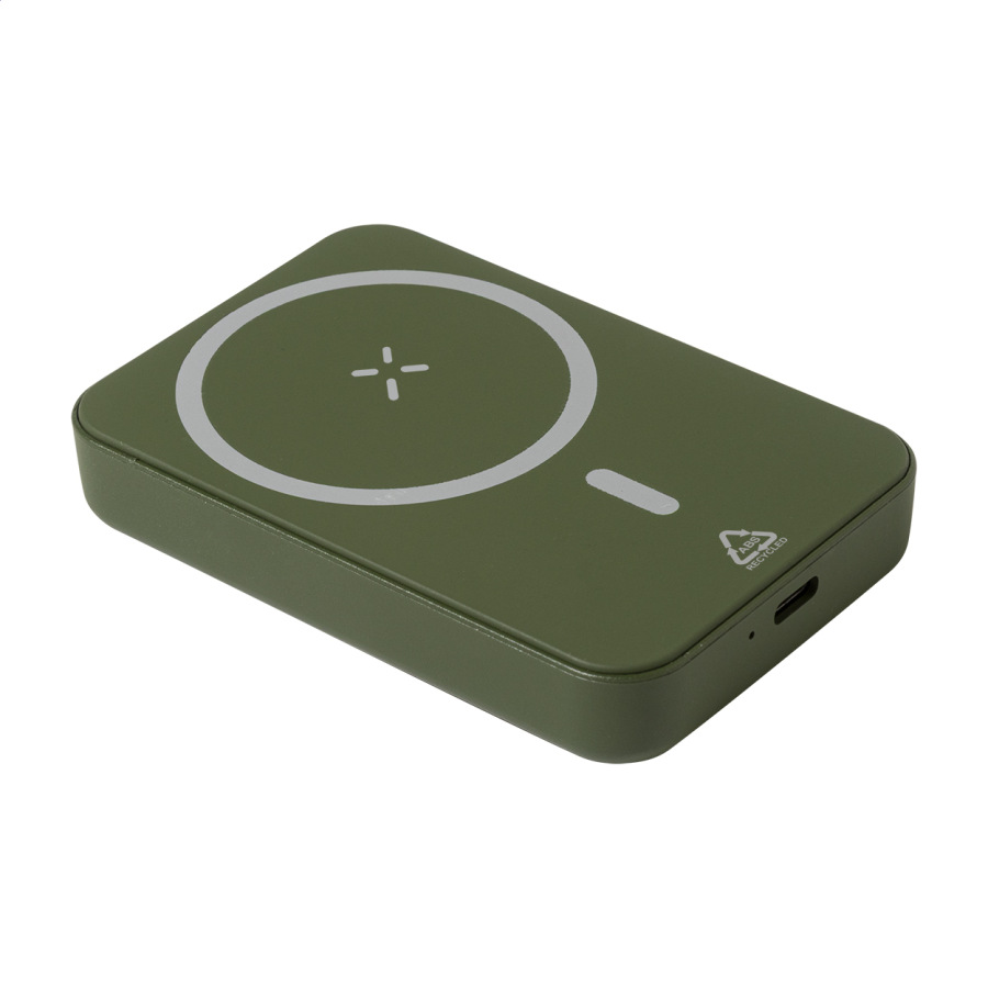 Power banka z recyklovaného ABS s 5000 mAh batériou a vstavanou magnetickou bezdrôtovou nabíjačkou (5W). So vstupom USB-C a portom pre nabíjačku. Vrátane USB nabíjacieho kábla.