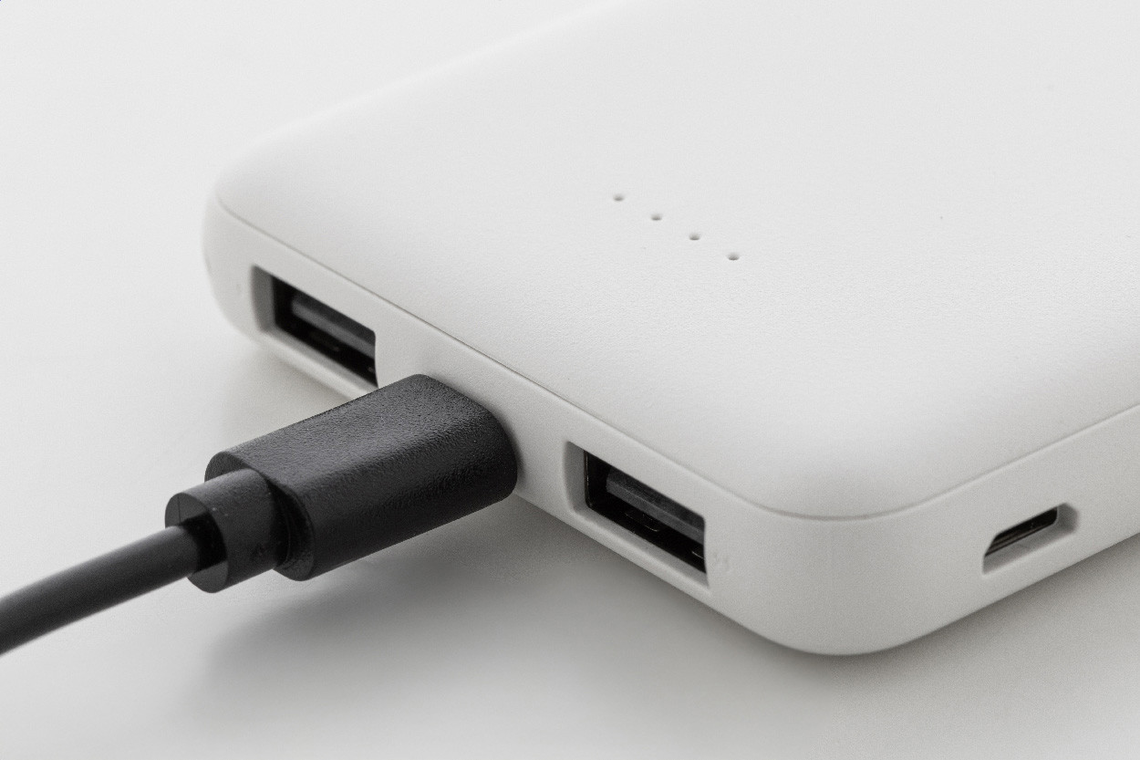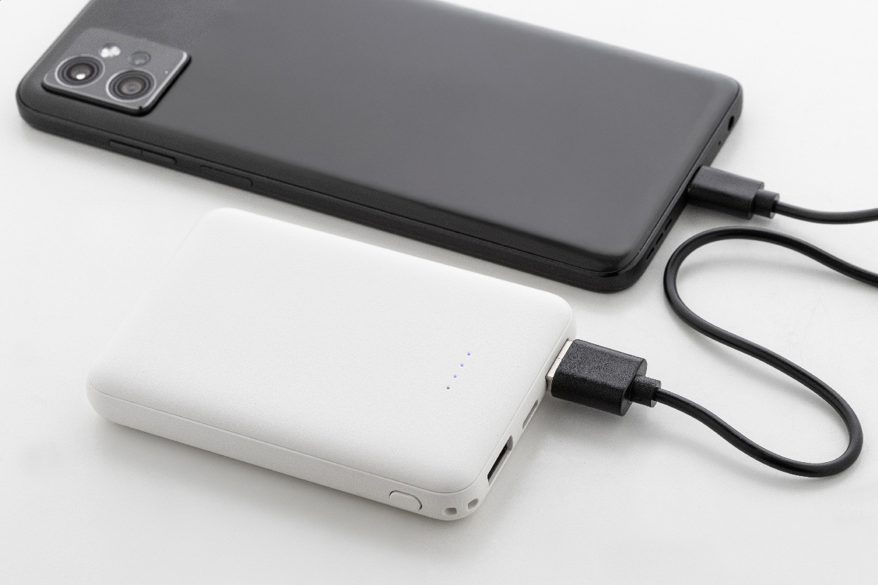 Power banka z recyklovaného ABS plastu s batériou 5 000 mAh. S 2 USB a 1 nabíjacím portom USB-C. Vstupné porty micro USB a USB-C. Vrátane nabíjacieho kábla USB.