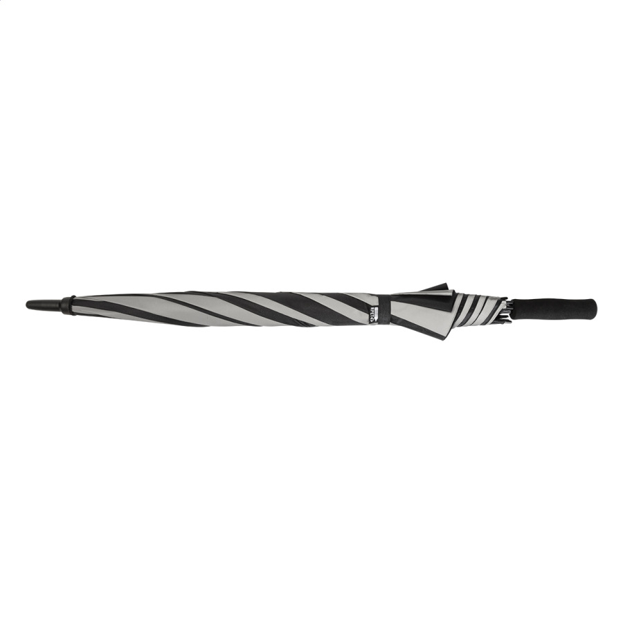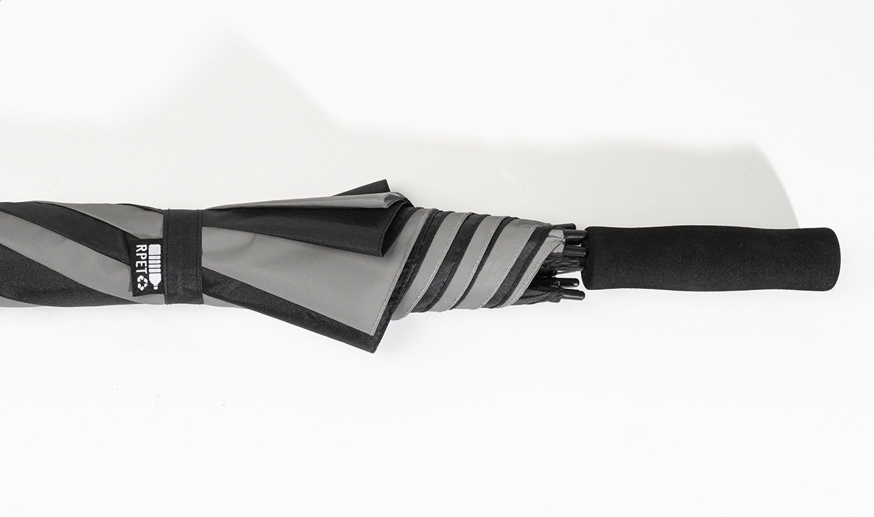 Veľký, manuálny vetruodolný dáždnik so 4 panelmi z 190T RPET pongee a 4 panelmi z reflexnej tkaniny. S celolaminátovým rámom a tyčou, rukoväťou z EVA. 190T RPET pongee. S charakteristickým RPET štítkom.
