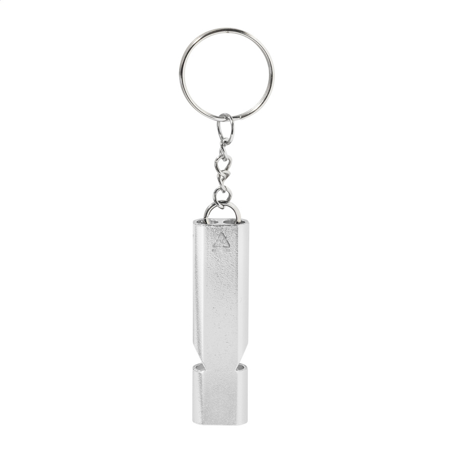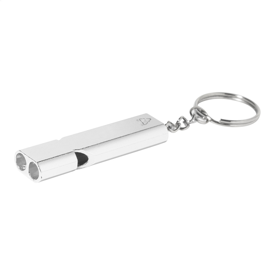 Píšťalka z recyklovaného hliníka s kovovým krúžkom na kľúče.