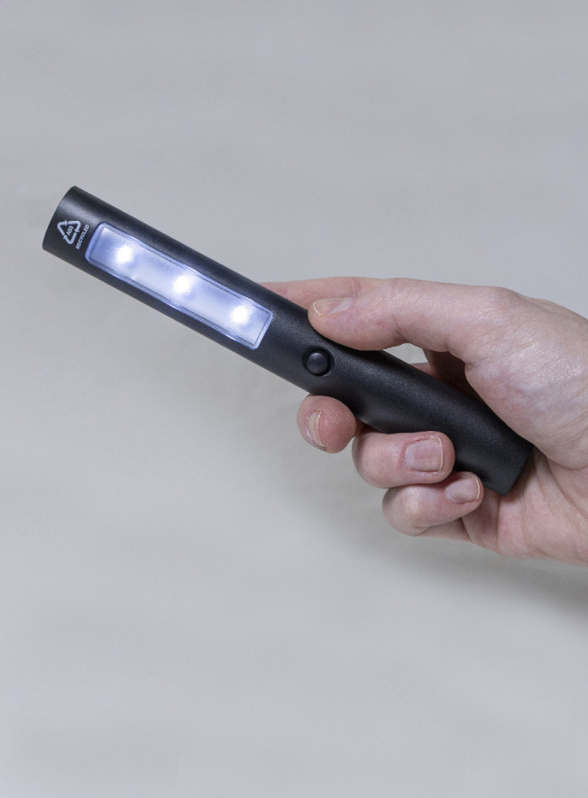 Núdzová autosvietidlo z recyklovaného ABS materiálu s 3 LED diódami a magnetmi na zadnej strane pre použitie bez použitia rúk. Vrátane gombíkových batérií.