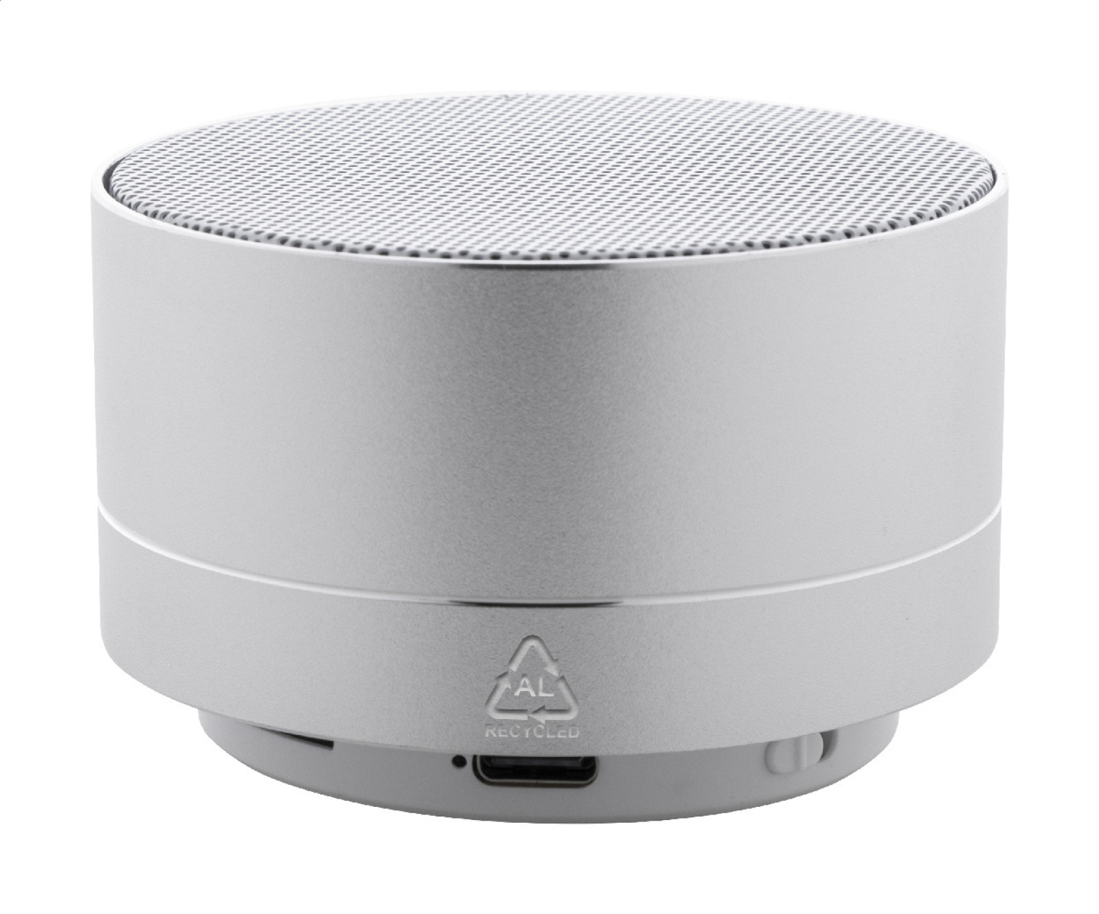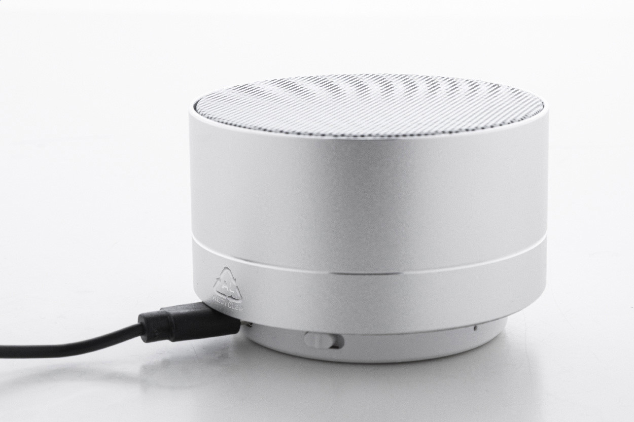 Bezdrôtový reproduktor z recyklovaného hliníka s kovovou sieťovinou, LED svetlom na spodnej strane a dobíjacou batériou (300 mAh). S funkciou handsfree hovorov a prehrávanie MP3 z micro SD karty. Vrátane nabíjacieho kábla USB.