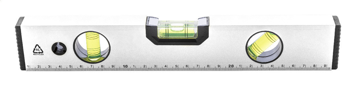 Magnetická vodováha z recyklovaného hliníka s tromi vodováhami (horizontálna, vertikálna a 45 °) a 30cm pravítkom.