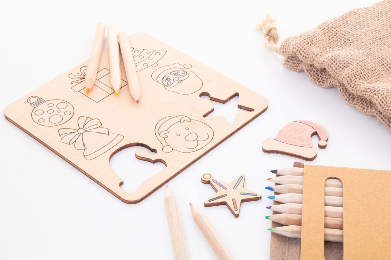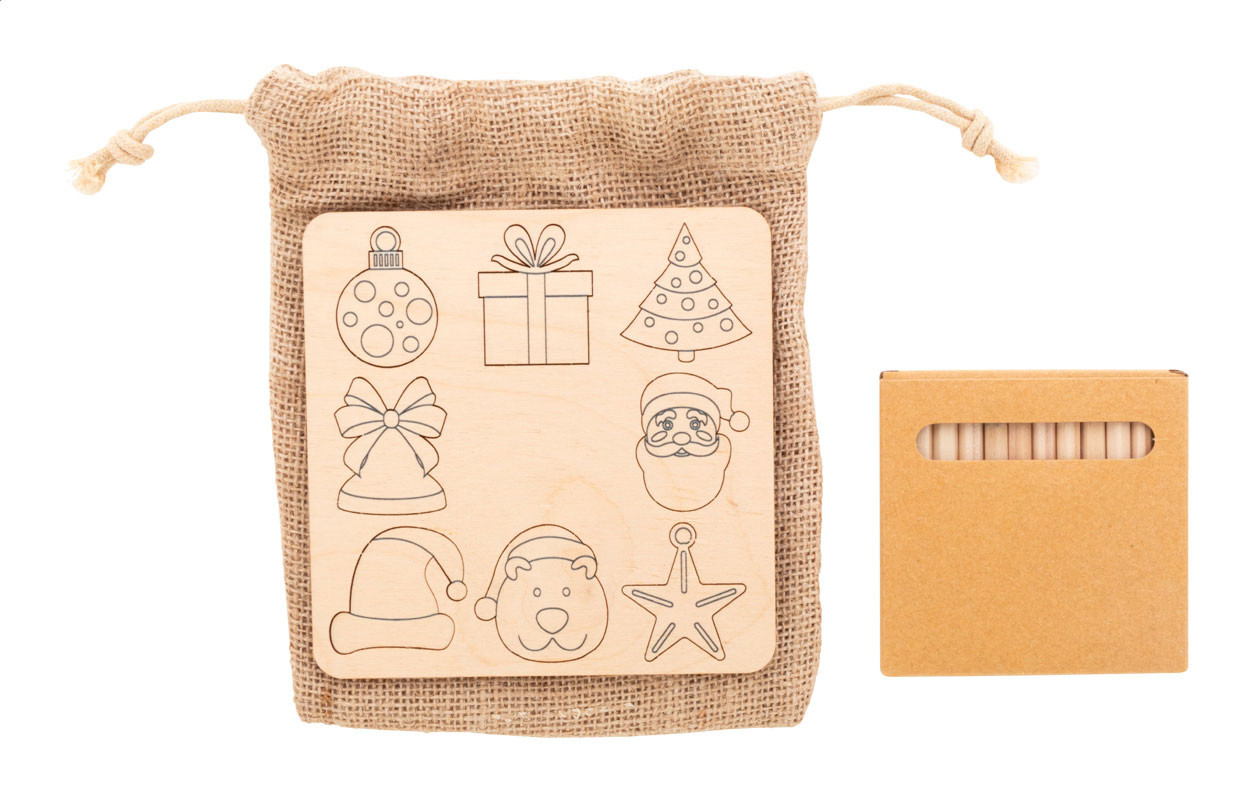 Vianočná vyfarbovacia hra z brezovej preglejky s jutovým puzdrom. Obsahuje tematické vyrezávané figúrky (8 ks) a drevené farebné ceruzky (12 ks) v papierovej krabičke.