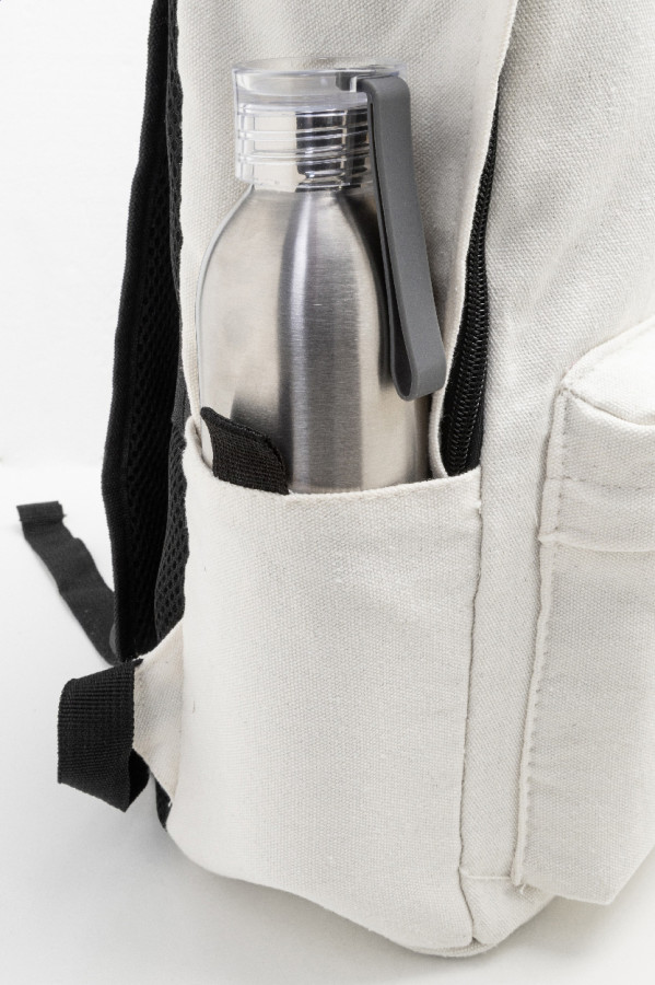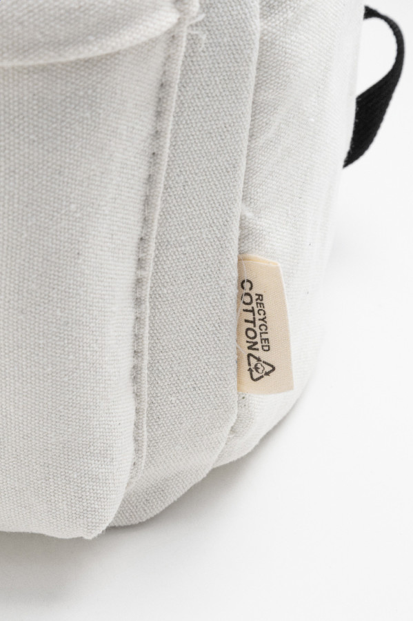 Recyklovaný plátený batoh s hlavnou priehradkou na zips, polstrovanou priehradkou na notebook (15"), 2 prednými vreckami na zips, bočnými vreckami, popruhom na kolieskach, polstrovaným chrbtom a ramennými popruhmi. 70% recyklovanej bavlny a 30% RPET polyesteru.