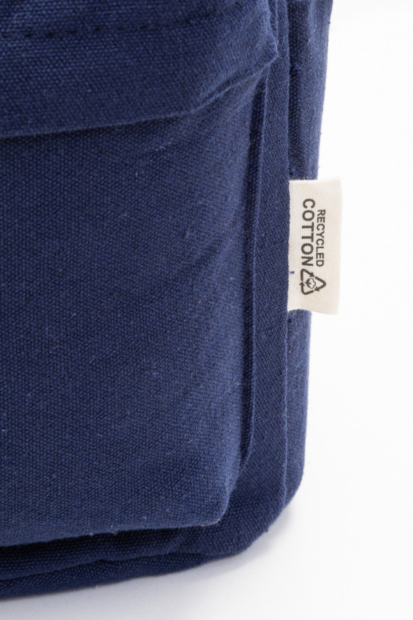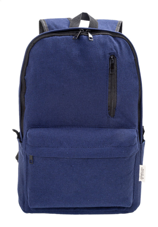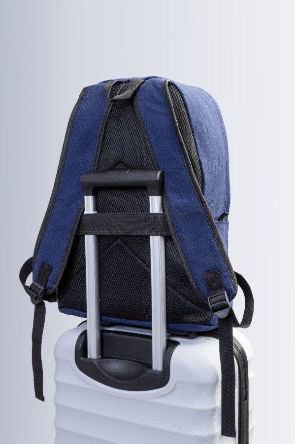 Recyklovaný plátený batoh s hlavnou priehradkou na zips, polstrovanou priehradkou na notebook (15"), 2 prednými vreckami na zips, bočnými vreckami, popruhom na kolieskach, polstrovaným chrbtom a ramennými popruhmi. 70% recyklovanej bavlny a 30% RPET polyesteru.