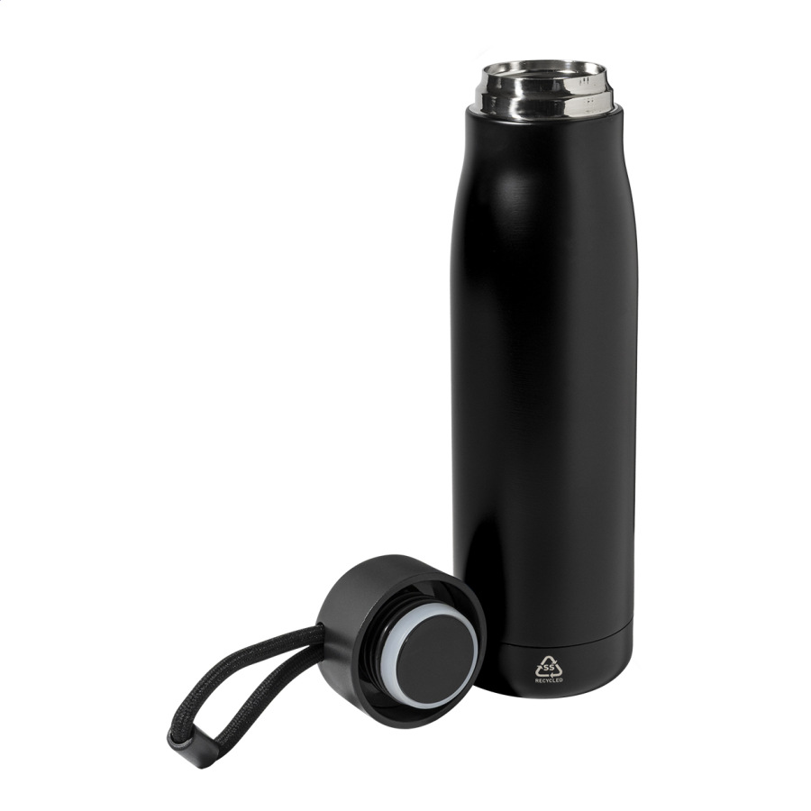 Dvojstenná, vákuovo izolovaná fľaša z recyklovanej nerezovej ocele s PP viečkom a integrovaným pútkom na nosenie so šnúrkou. 500 ml.