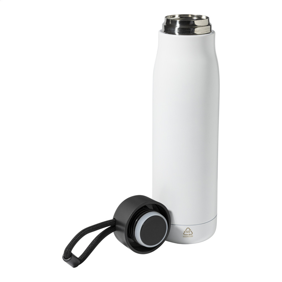 Dvojstenná, vákuovo izolovaná fľaša z recyklovanej nerezovej ocele s PP viečkom a integrovaným pútkom na nosenie so šnúrkou. 500 ml.