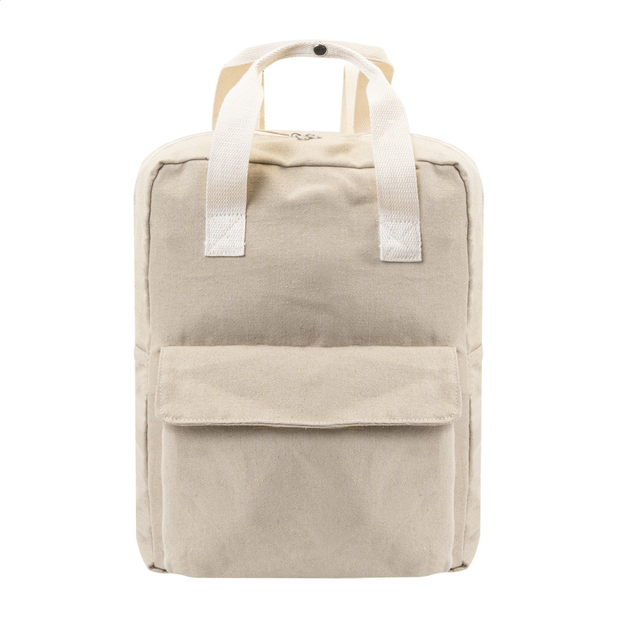 Batoh z recyklovaného plátna s hlavnou priehradkou na zips, polstrovanou priehradkou na notebook (13") a predným vreckom na suchý zips. 70% recyklovanej bavlny a 30% RPET polyesteru. S výraznou etiketou o recyklovanej bavlne.