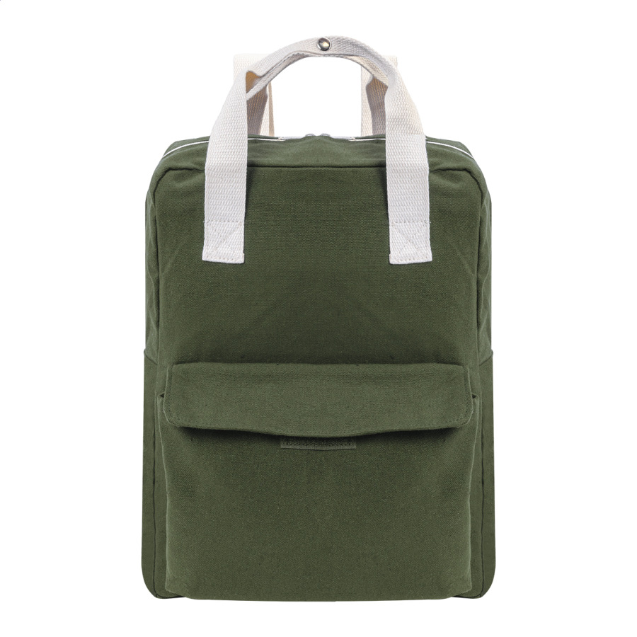 Batoh z recyklovaného plátna s hlavnou priehradkou na zips, polstrovanou priehradkou na notebook (13") a predným vreckom na suchý zips. 70% recyklovanej bavlny a 30% RPET polyesteru. S výraznou etiketou o recyklovanej bavlne.