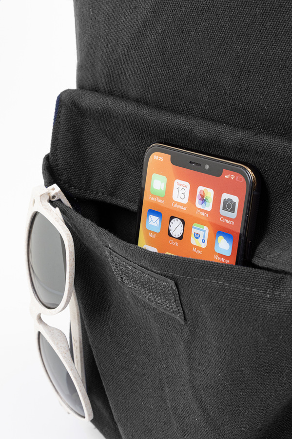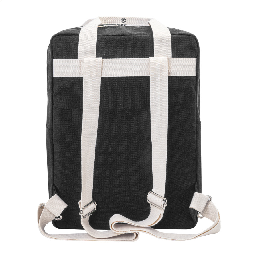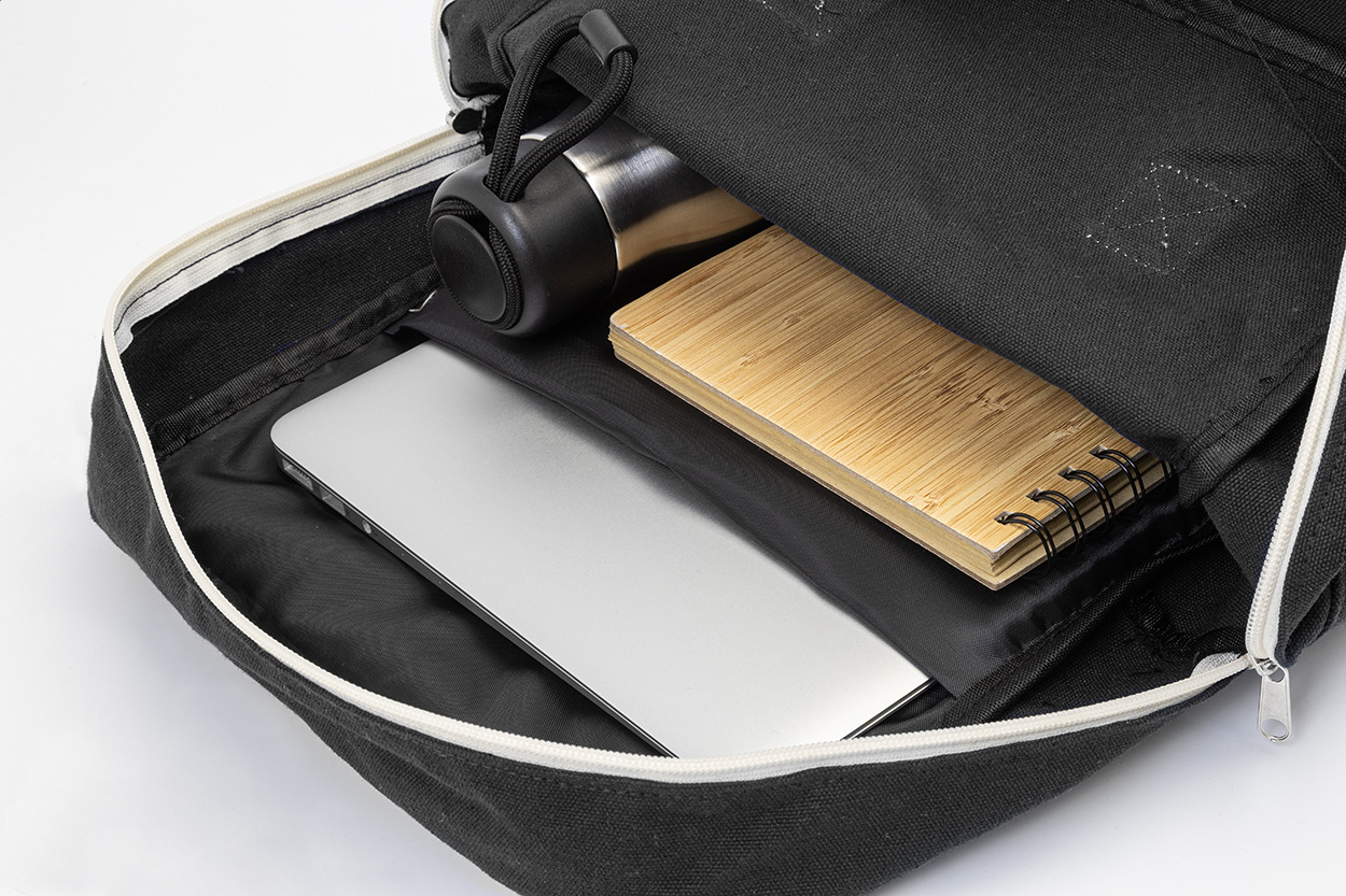 Batoh z recyklovaného plátna s hlavnou priehradkou na zips, polstrovanou priehradkou na notebook (13") a predným vreckom na suchý zips. 70% recyklovanej bavlny a 30% RPET polyesteru. S výraznou etiketou o recyklovanej bavlne.