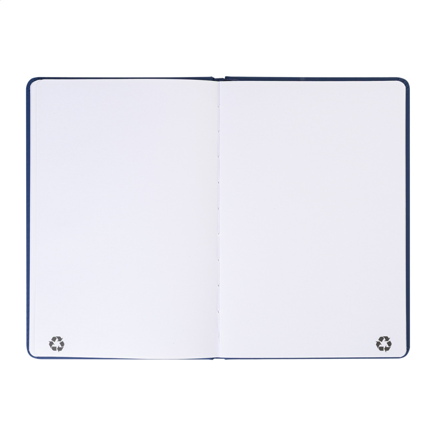 Blok A5 z recyklovanej PU kože so 100 čistými listami z recyklovaného papiera. So záložkou v zodpovedajúcej farbe a gumičkou.