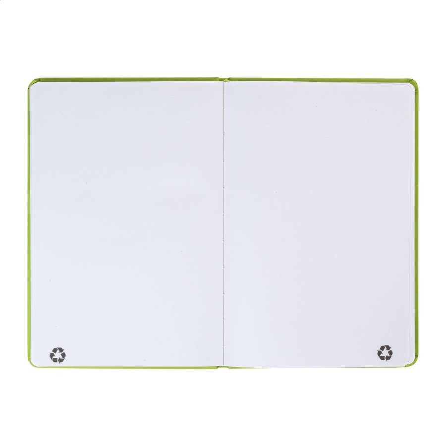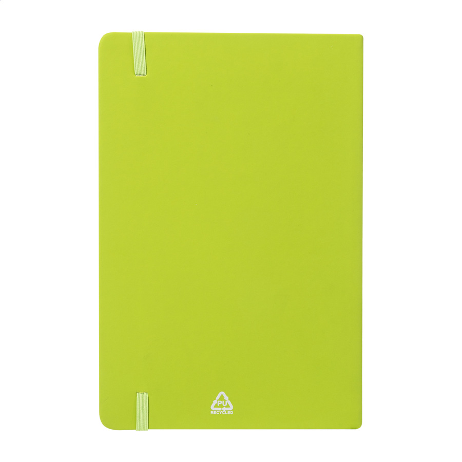 Blok A5 z recyklovanej PU kože so 100 čistými listami z recyklovaného papiera. So záložkou v zodpovedajúcej farbe a gumičkou.