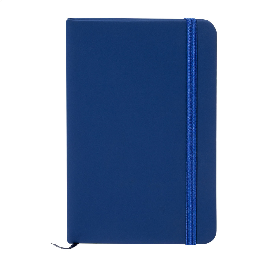 Blok A5 z recyklovanej PU kože so 100 čistými listami z recyklovaného papiera. So záložkou v zodpovedajúcej farbe a gumičkou.