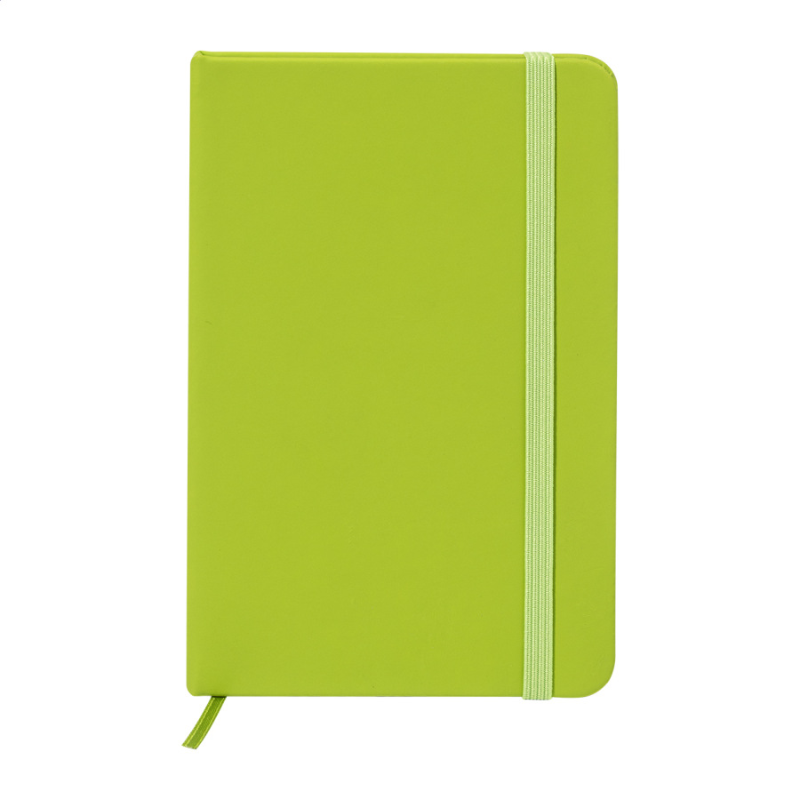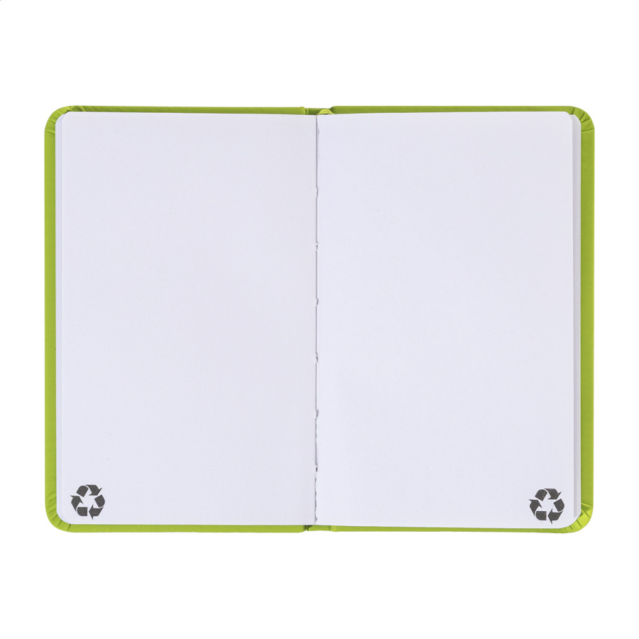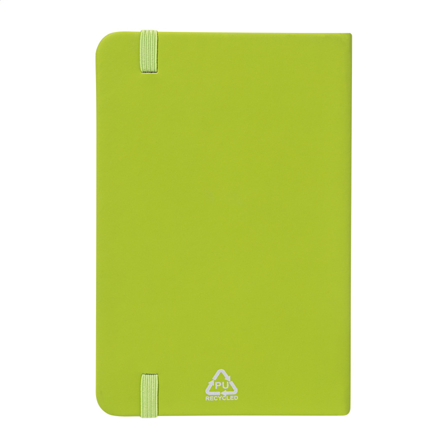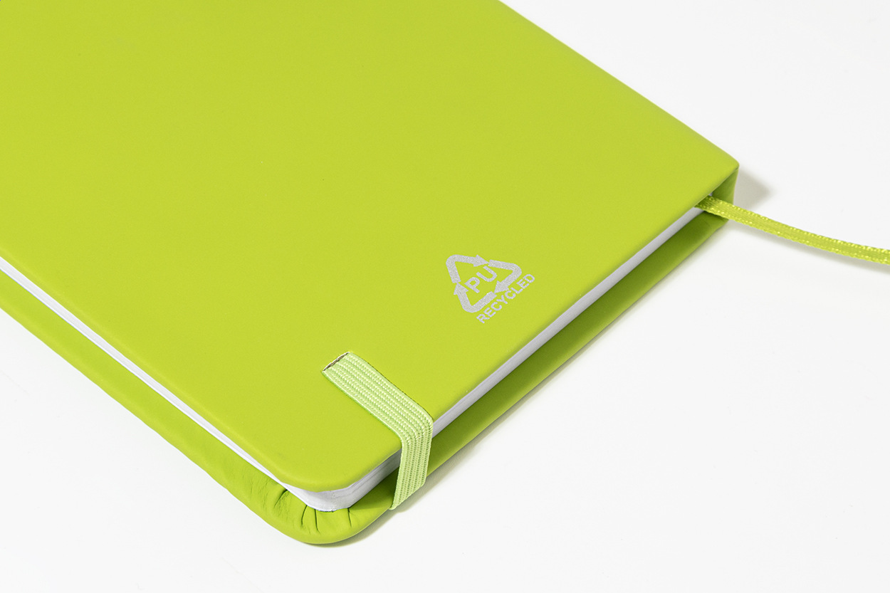 Blok A5 z recyklovanej PU kože so 100 čistými listami z recyklovaného papiera. So záložkou v zodpovedajúcej farbe a gumičkou.