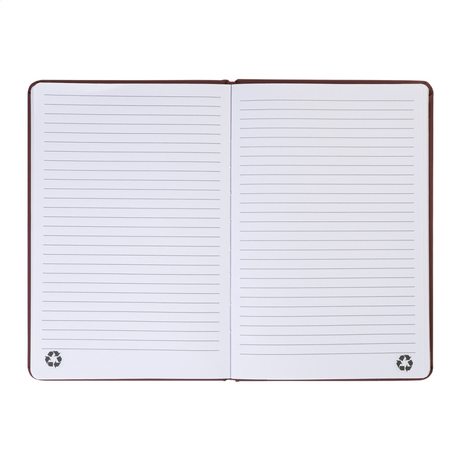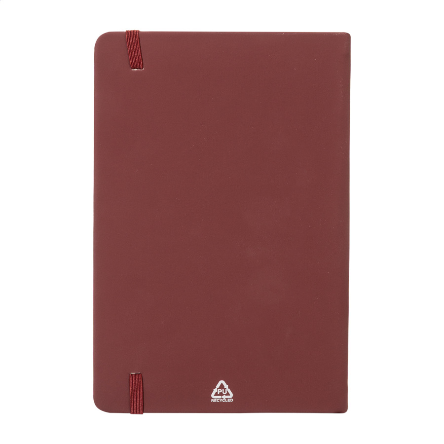 Blok potiahnutý recyklovanou PU kožou so 100 linkovanými listami z recyklovaného papiera. So záložkou v zodpovedajúcej farbe a gumičkou. Veľkosť A5.