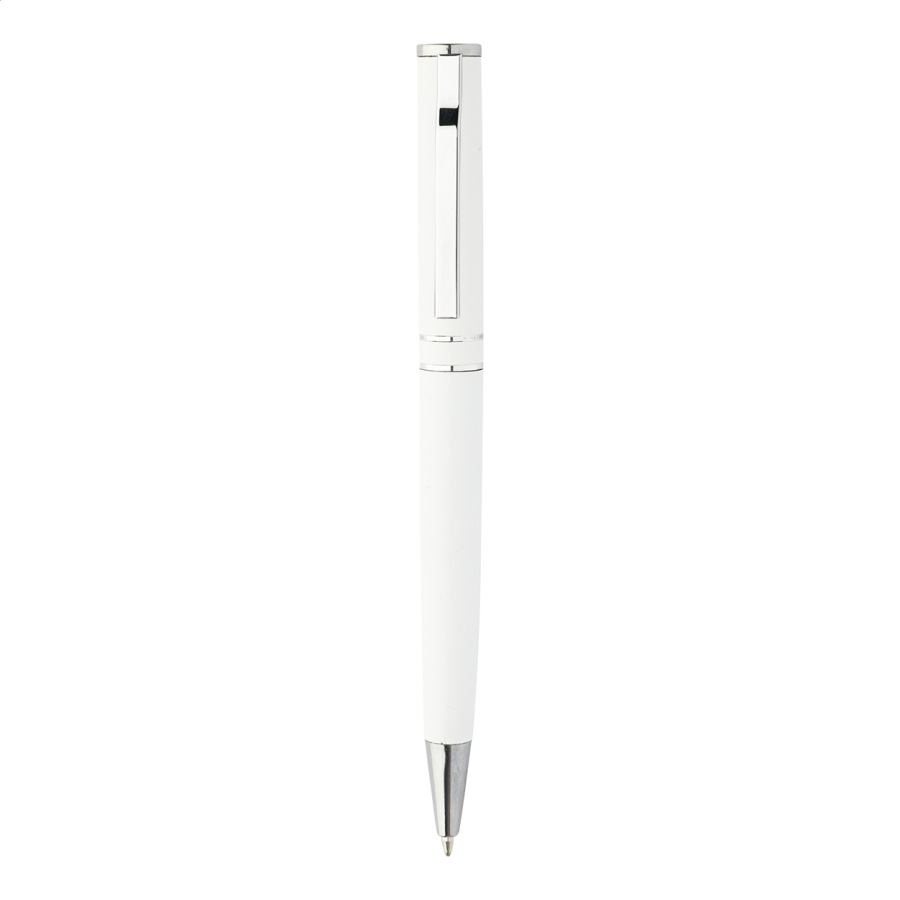 Guľôčkové pero z recyklovaného hliníka s chrómovanými časťami a krúžkami. V čiernej darčekovej krabičke. S modrou náplňou.